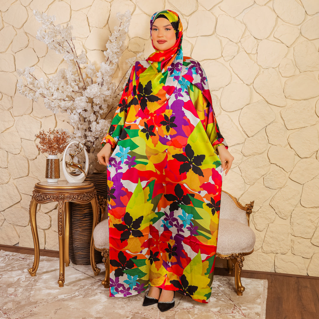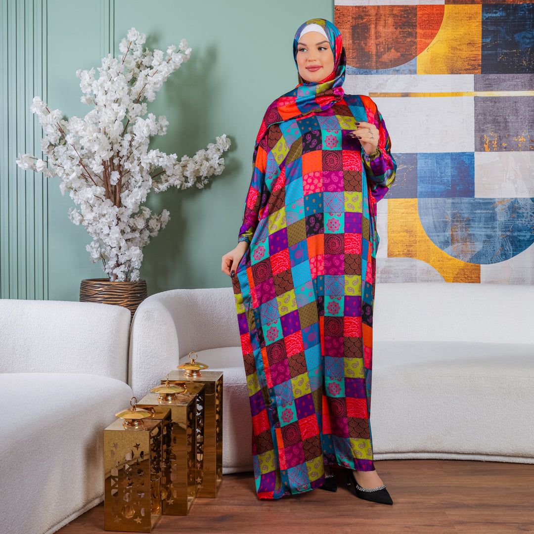 إسدال حرير ستان طباعة ديجيتال من تصميماتنا الخاصة فري سايز يناسب ٧٠ك إلى ١٠٠ك بطرحة...