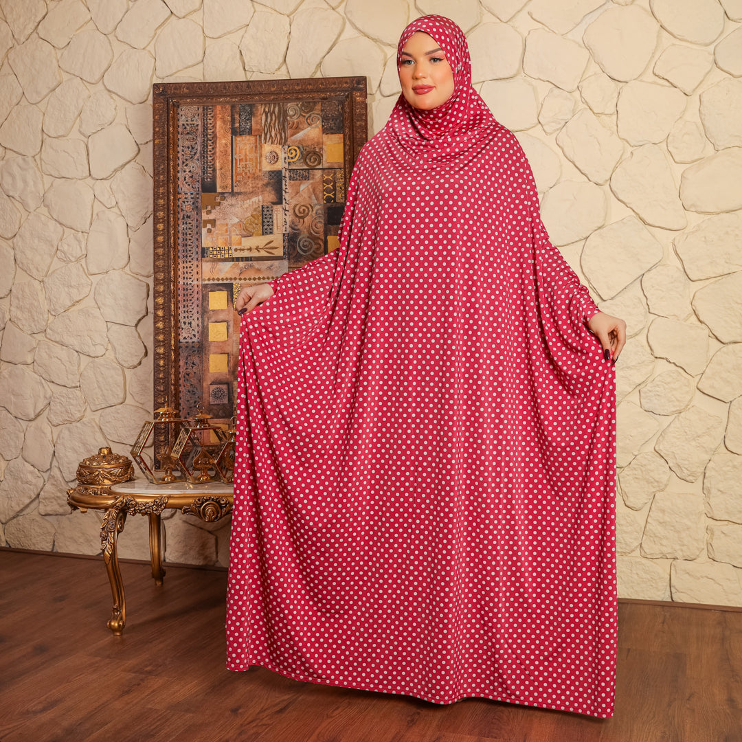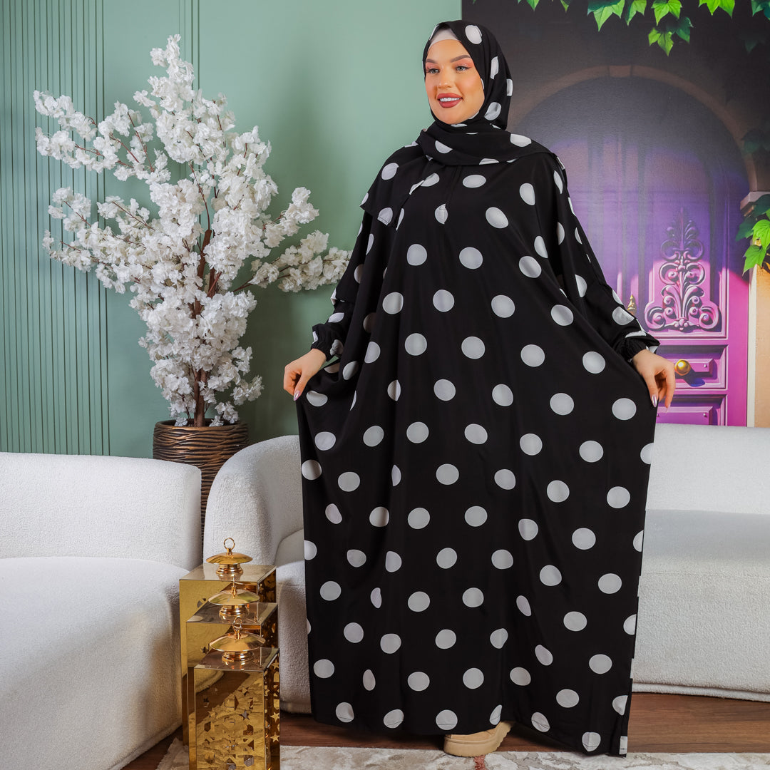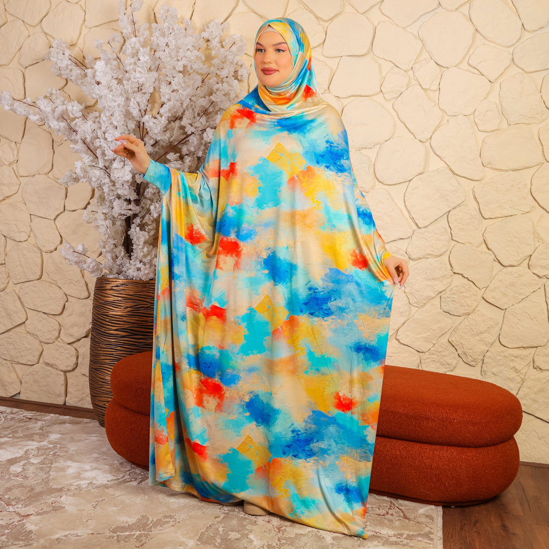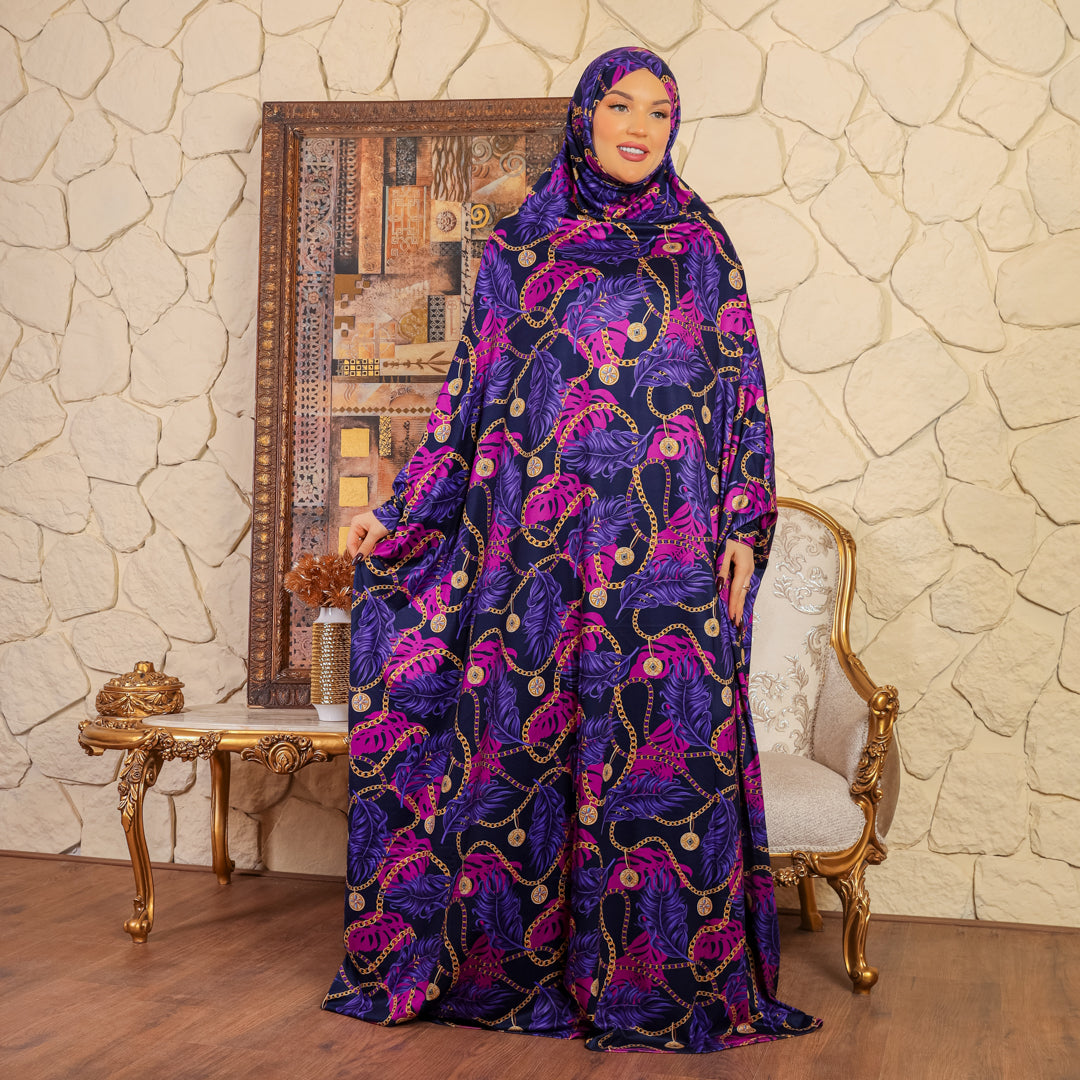إسدال حرير ستان طباعة ديجيتال من تصميماتنا الخاصةفري سايز يناسب ٧٠ك إلى ١٣٠كبطرحة متصلة