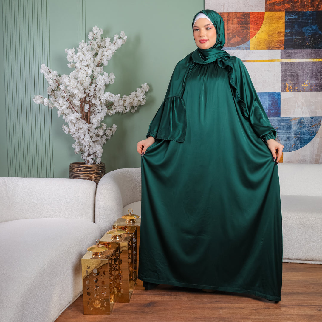 إسدال حرير ستان ألوان سادة واسع و فضفاض فري سايز يناسب ٧٠ك إلى ١٣٠ك بطرحة
