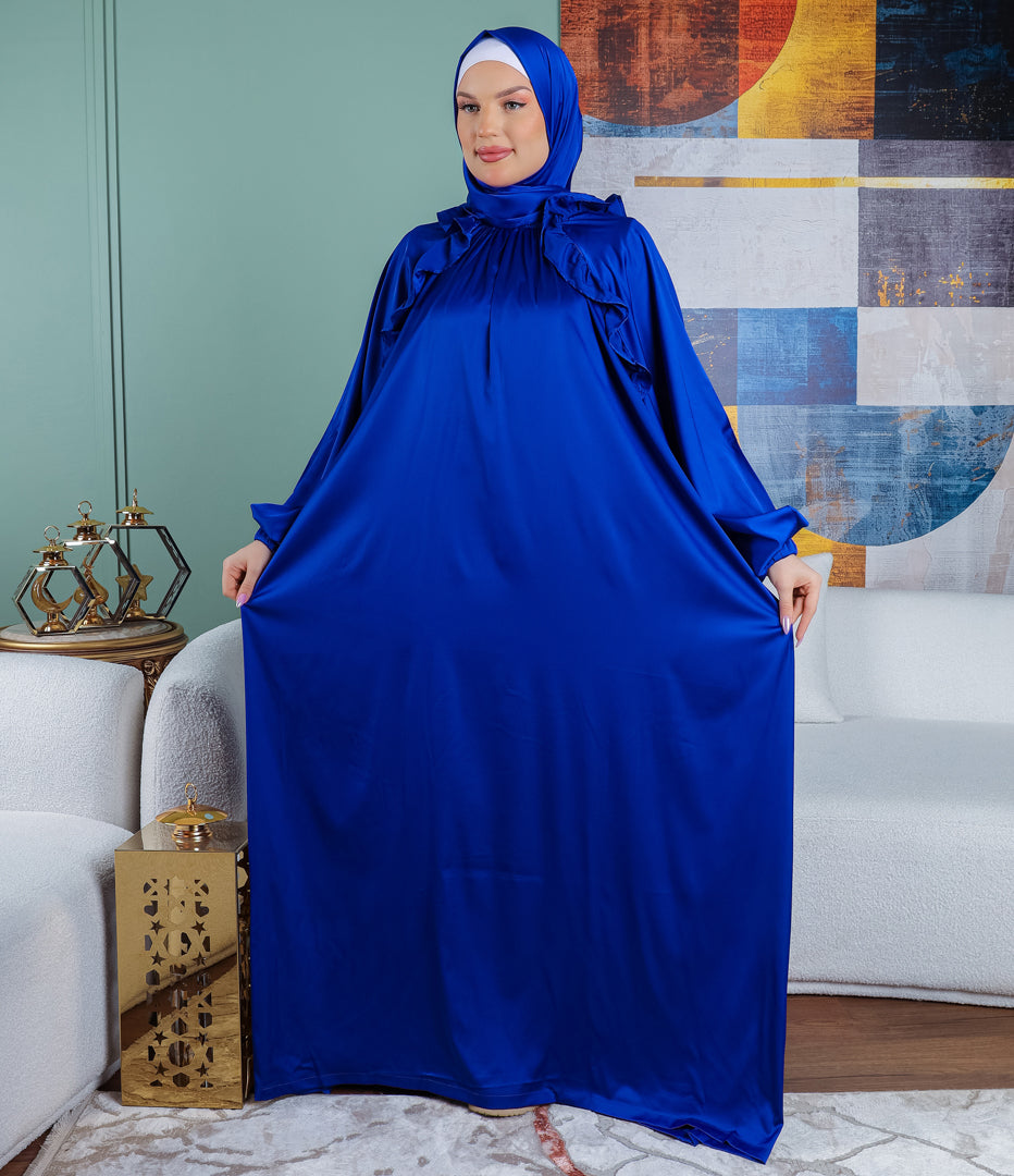 إسدال حرير ستان ألوان سادة واسع و فضفاض فري سايز يناسب ٧٠ك إلى ١٣٠ك بطرحة
