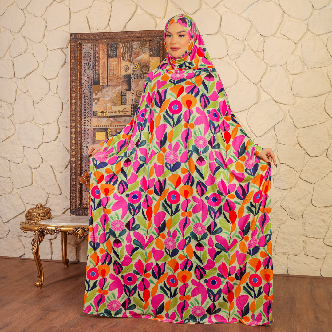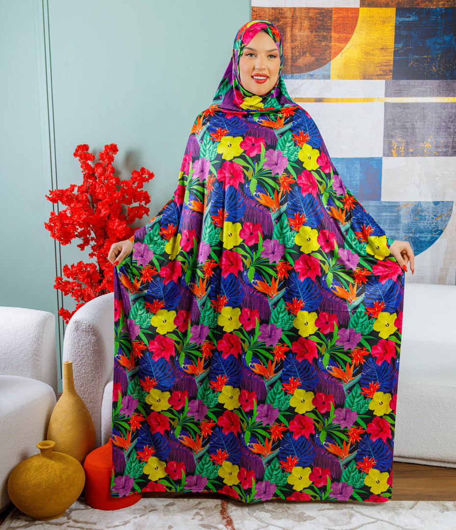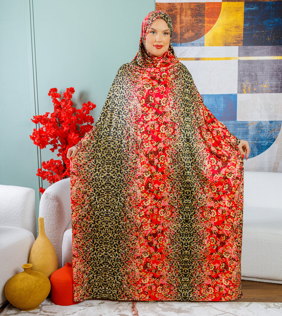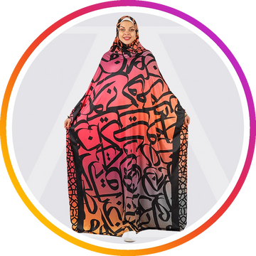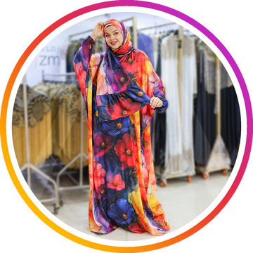 إسدال حرير ستان طباعة ديجيتال من تصميماتنا الخاصةفري سايز يناسب ٧٠ك إلى ١٣٠كبطرحة متصلة
