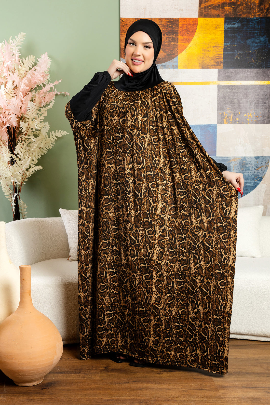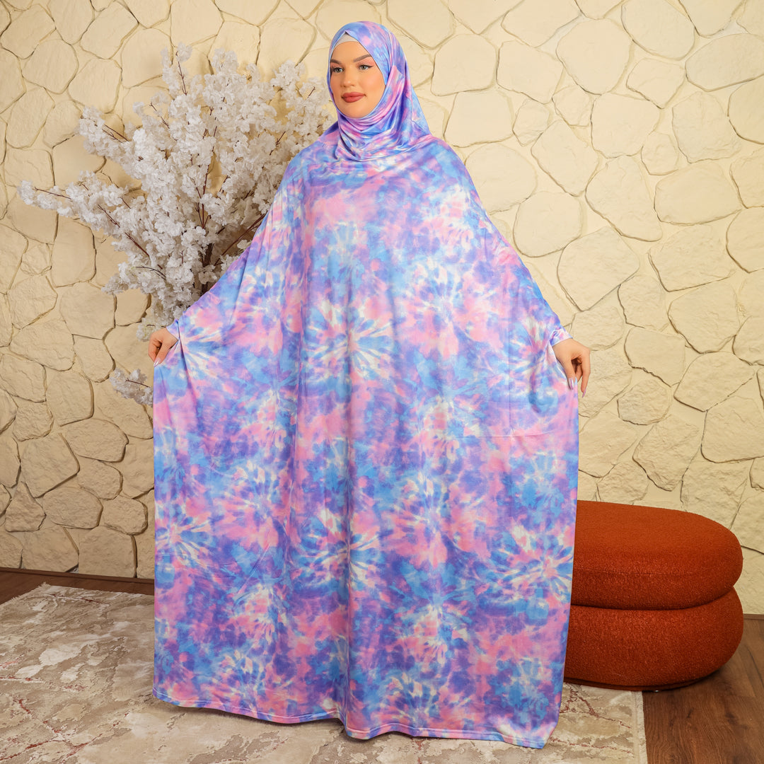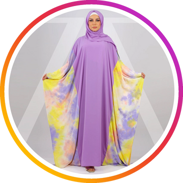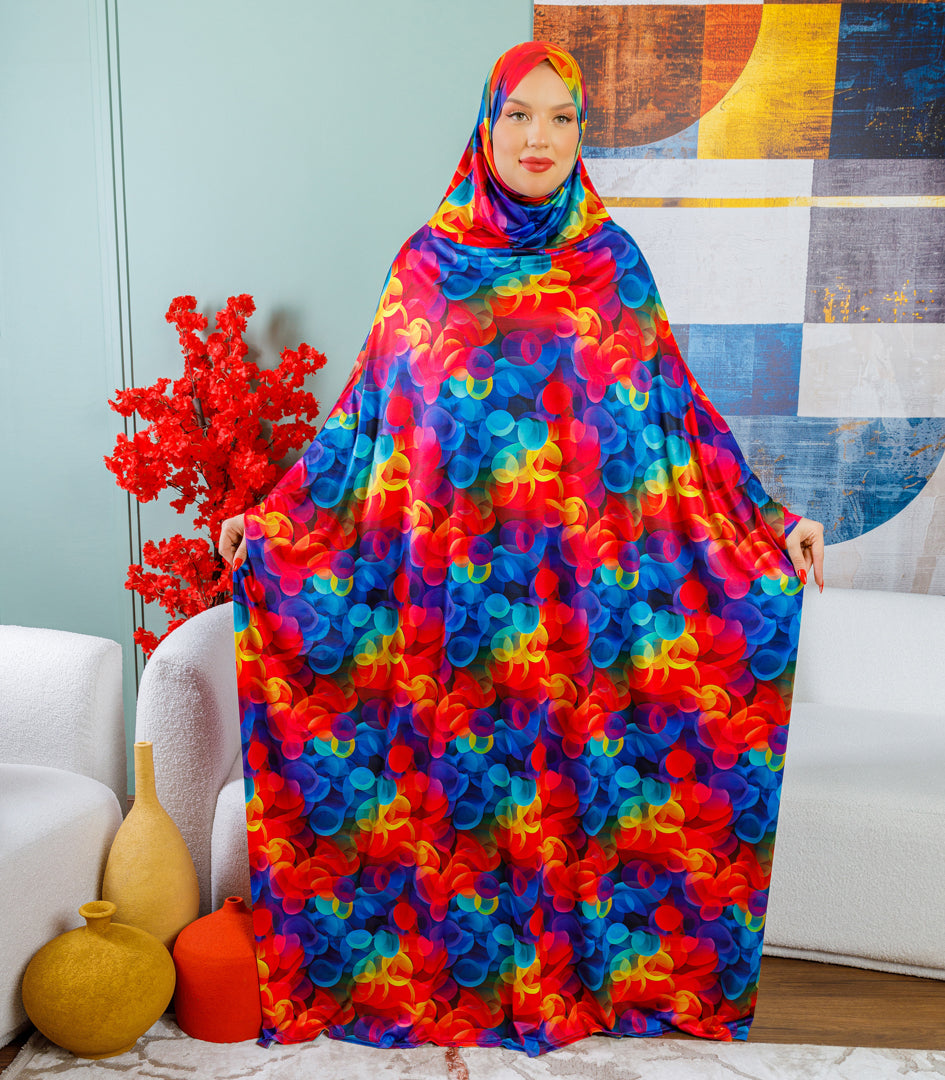 إسدال حرير ستان طباعة ديجيتال من تصميماتنا الخاصةفري سايز يناسب ٧٠ك إلى ١٣٠كبطرحة متصلة