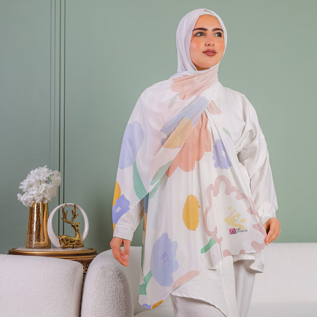 طرحة من الكريب شيفون الناعم مطبوعة ديجيتال بتصميمات زمرد فاشون الفريدة. مقاس ٢متر في ٧٠...