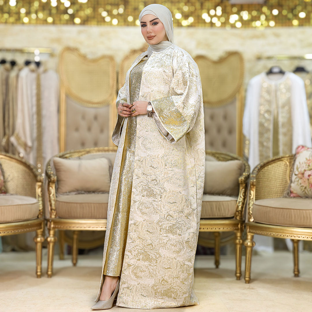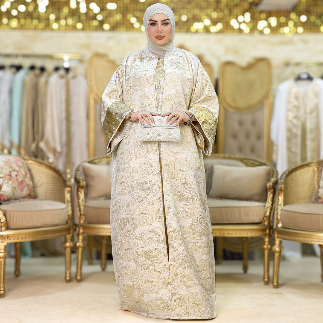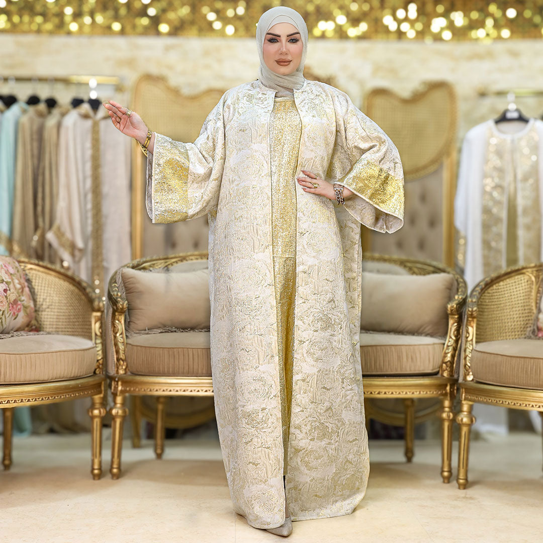 طقم قطعتين سواريه بروكار قفطان بحريني من قماش البروكار السواريه اللامع مع بيزك بروكار ذهبي فري سايز يناسب ٧٠ك إلى ١٠٠ك
