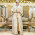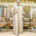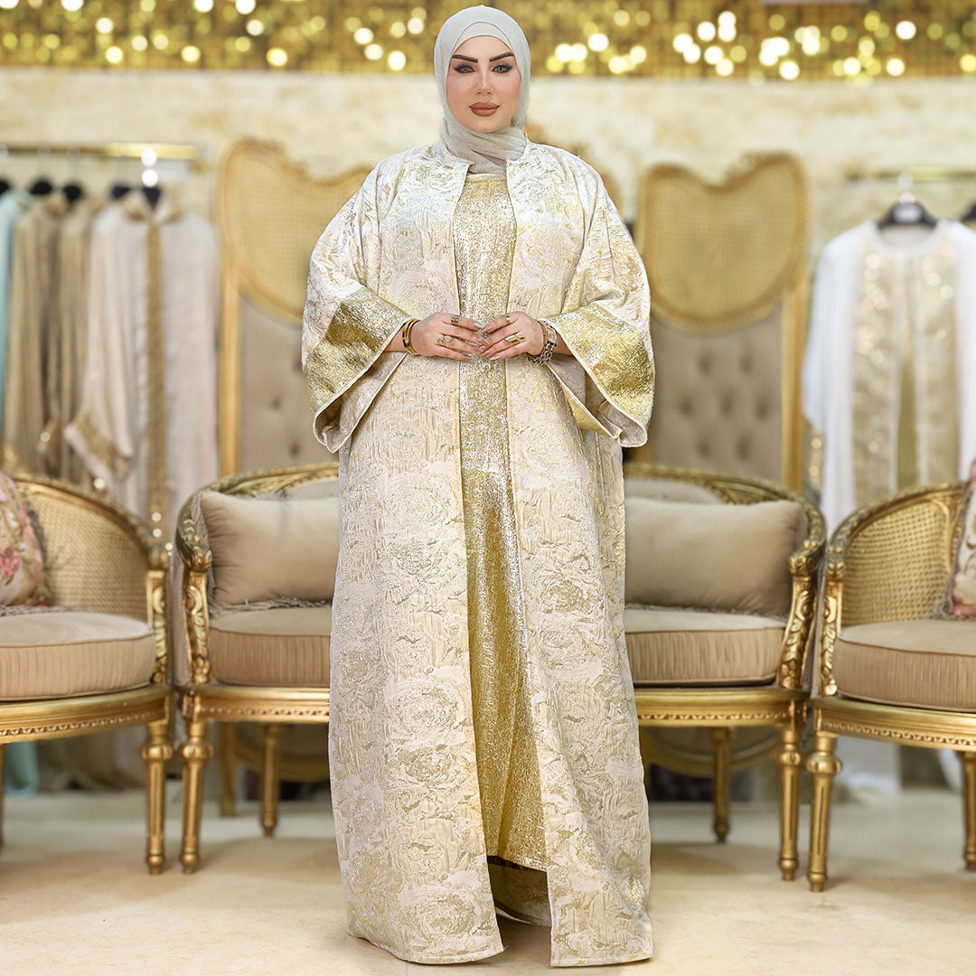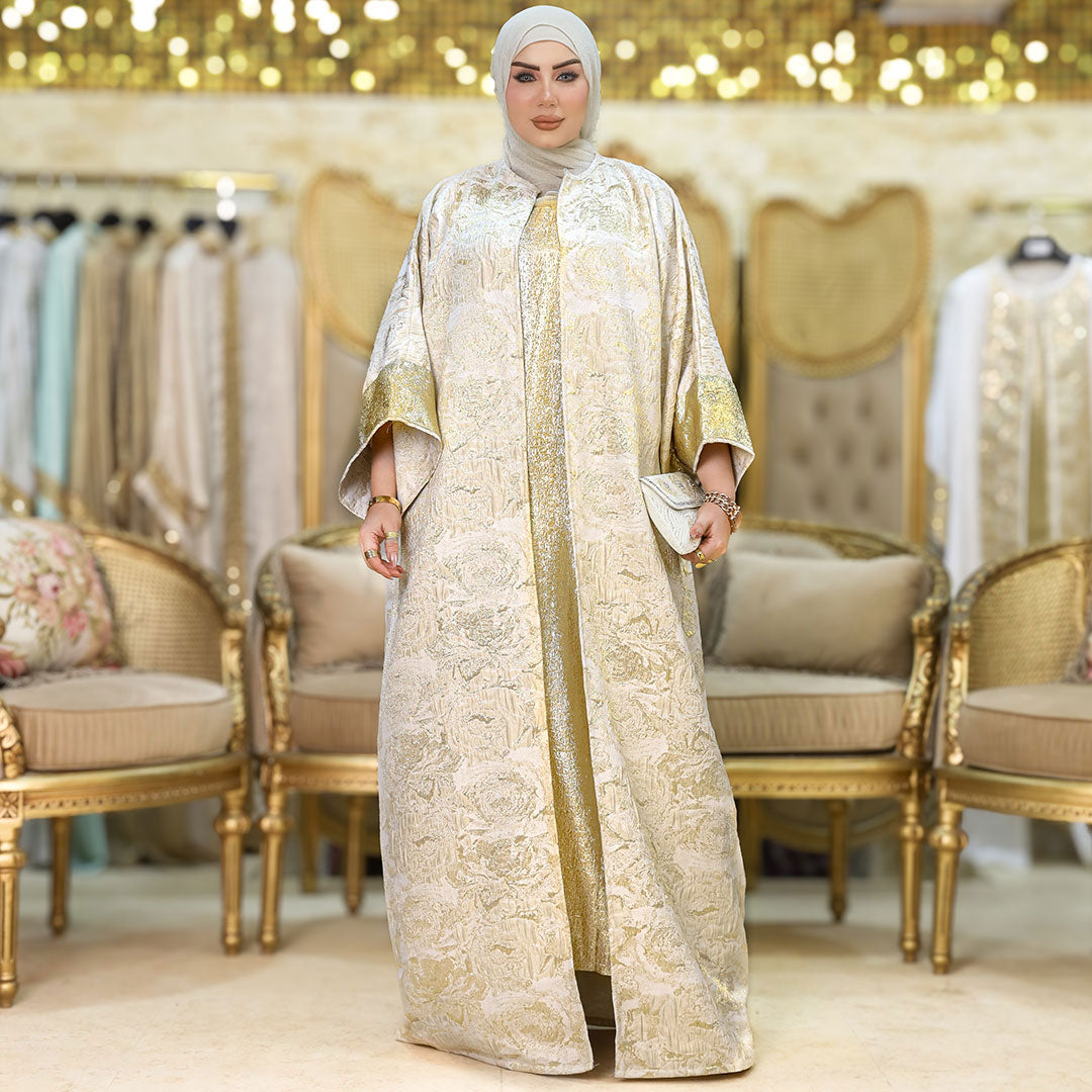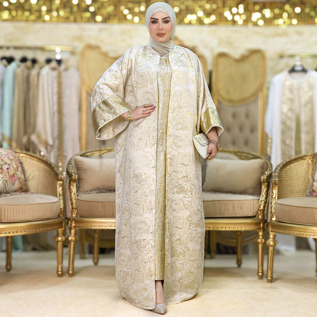 طقم قطعتين سواريه بروكار قفطان بحريني من قماش البروكار السواريه اللامع مع بيزك بروكار ذهبي فري سايز يناسب ٧٠ك إلى ١٠٠ك