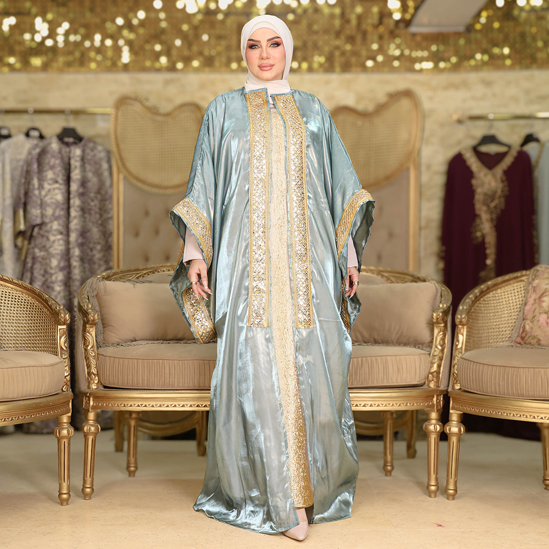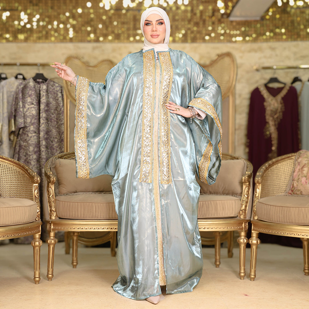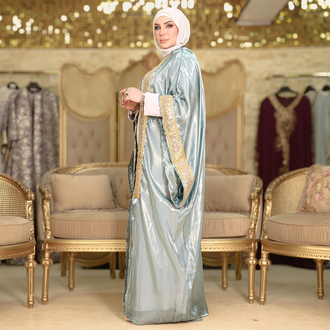 قفطان بحريني من قماش الأورجانزا الشيمر مع شريط تطريز هندي فري سايز يناسب ٧٠ك إلى ١٣٠ك