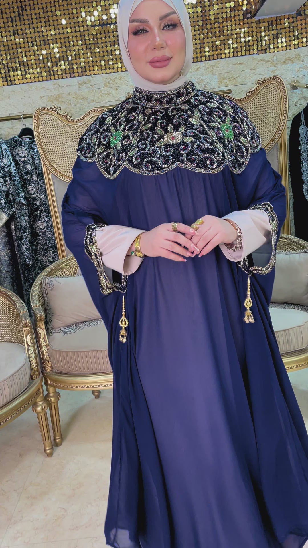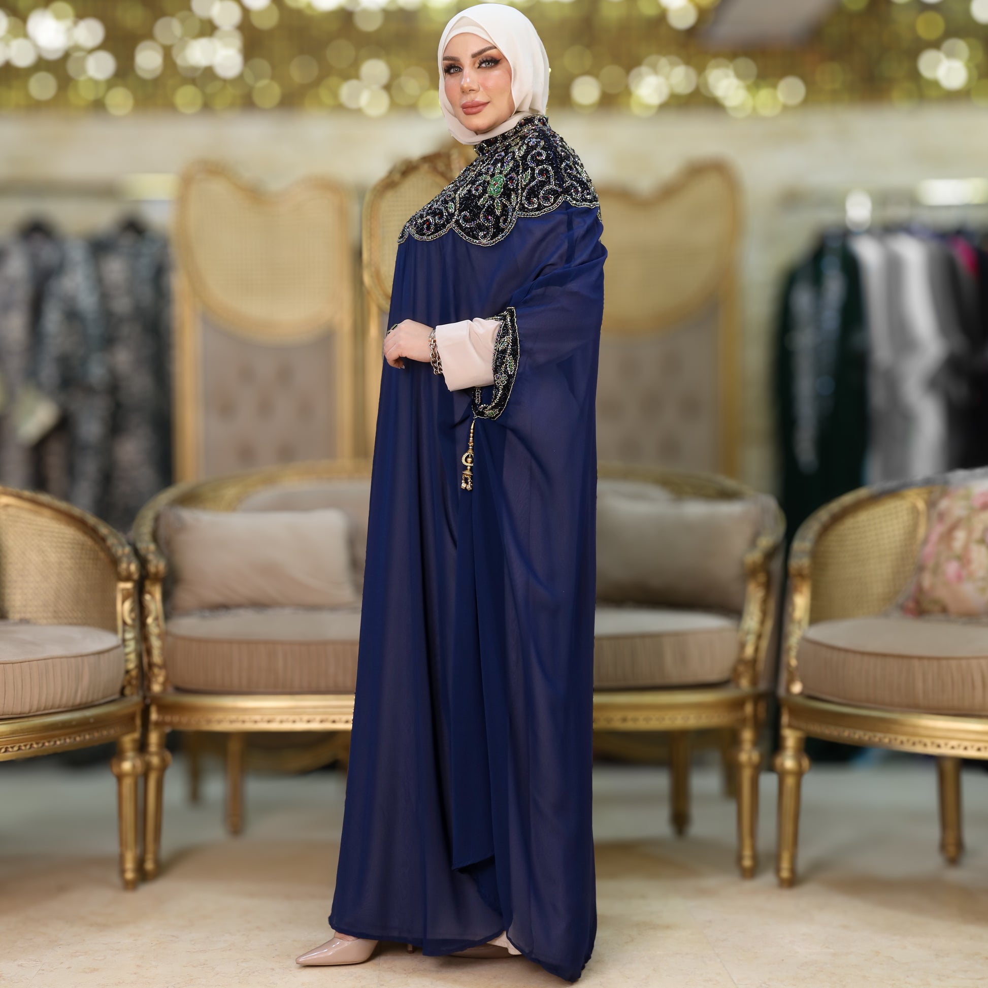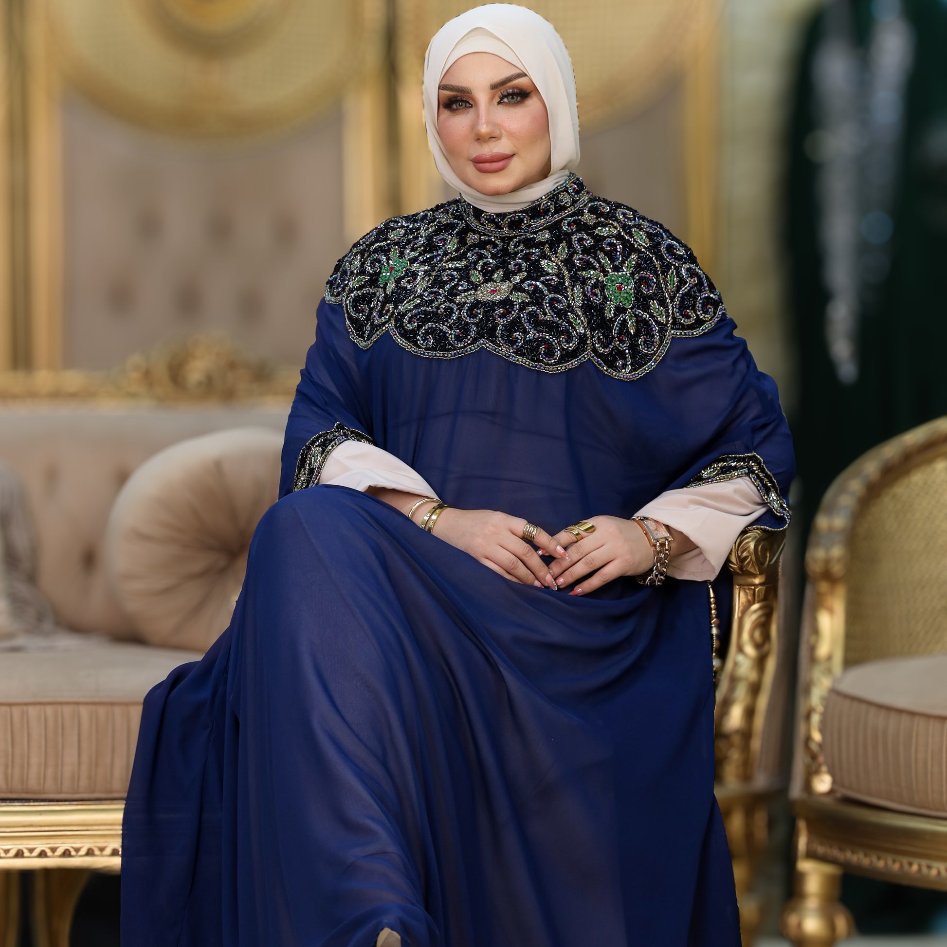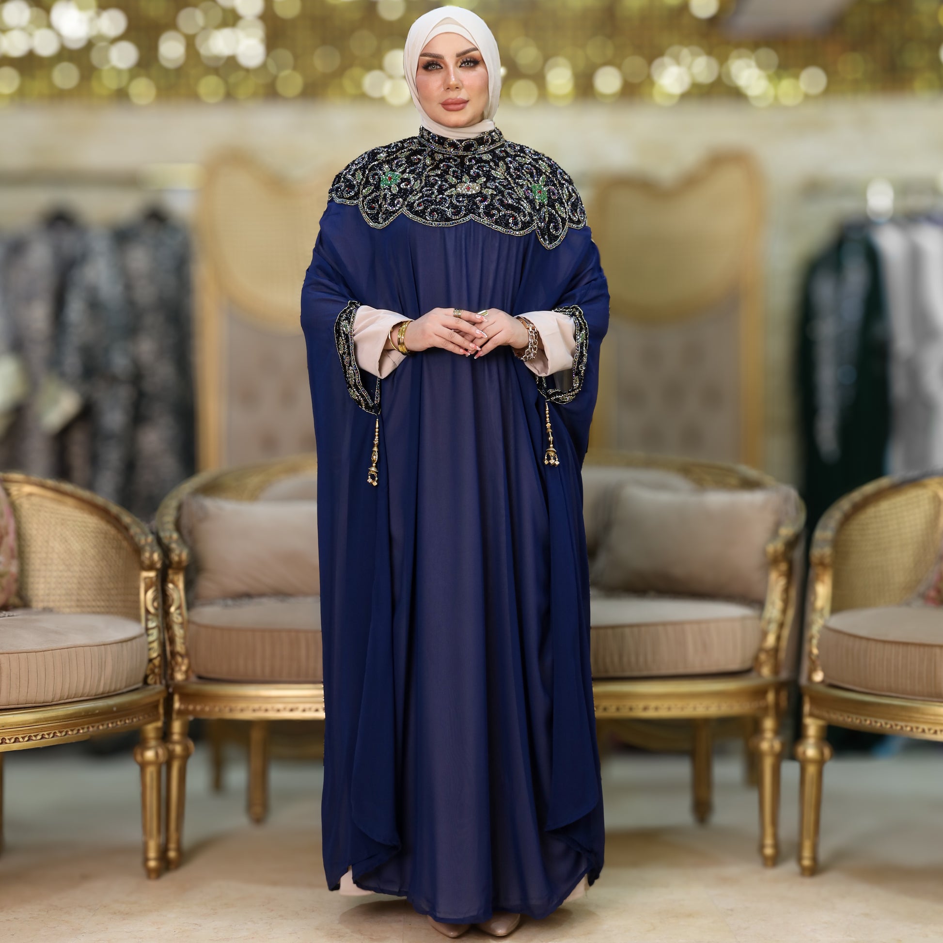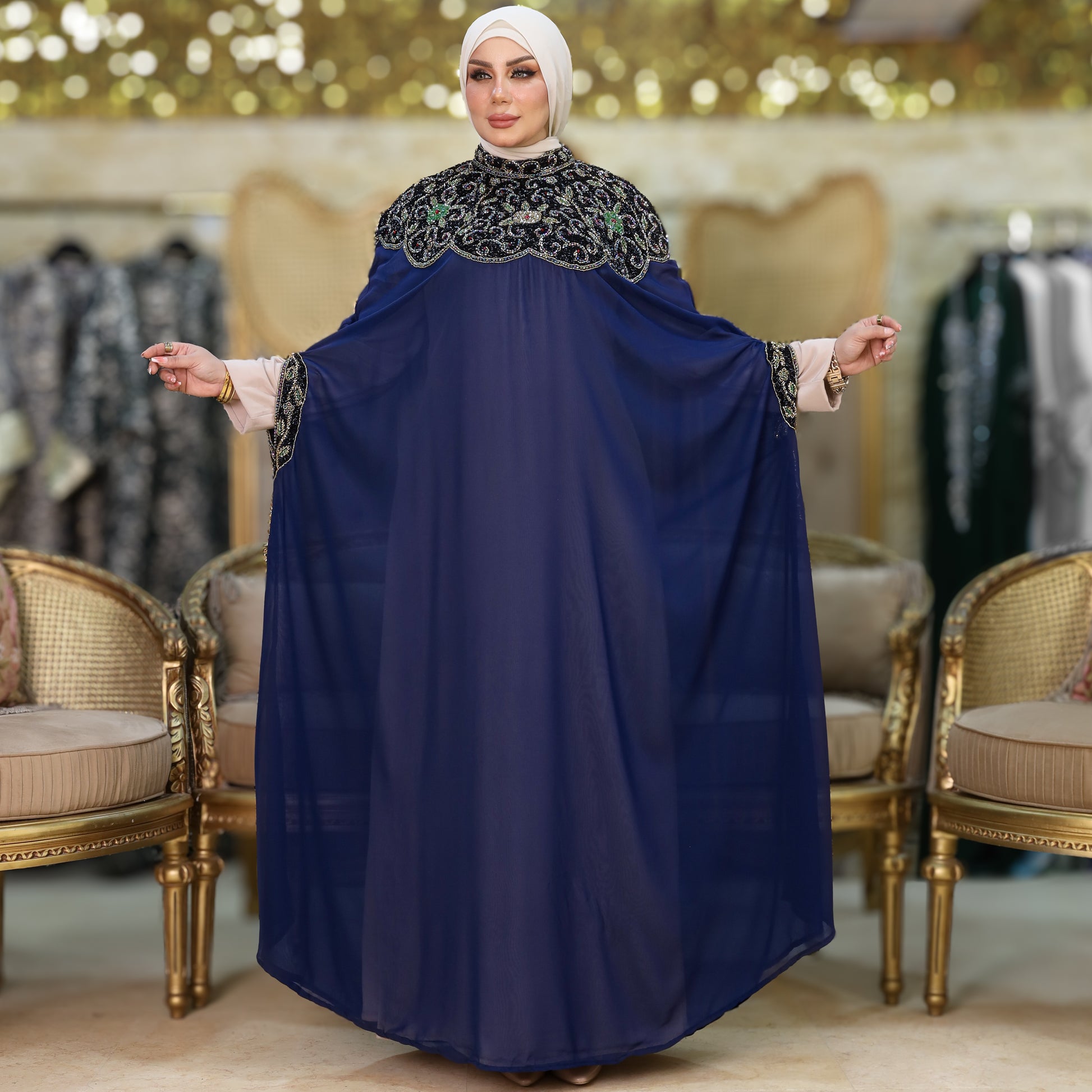 دراعة كويتي تطريز هاند ميد هندي شيفون طبقتين فري سايز تناسب ٧٠ك إلى ١٠٠ك