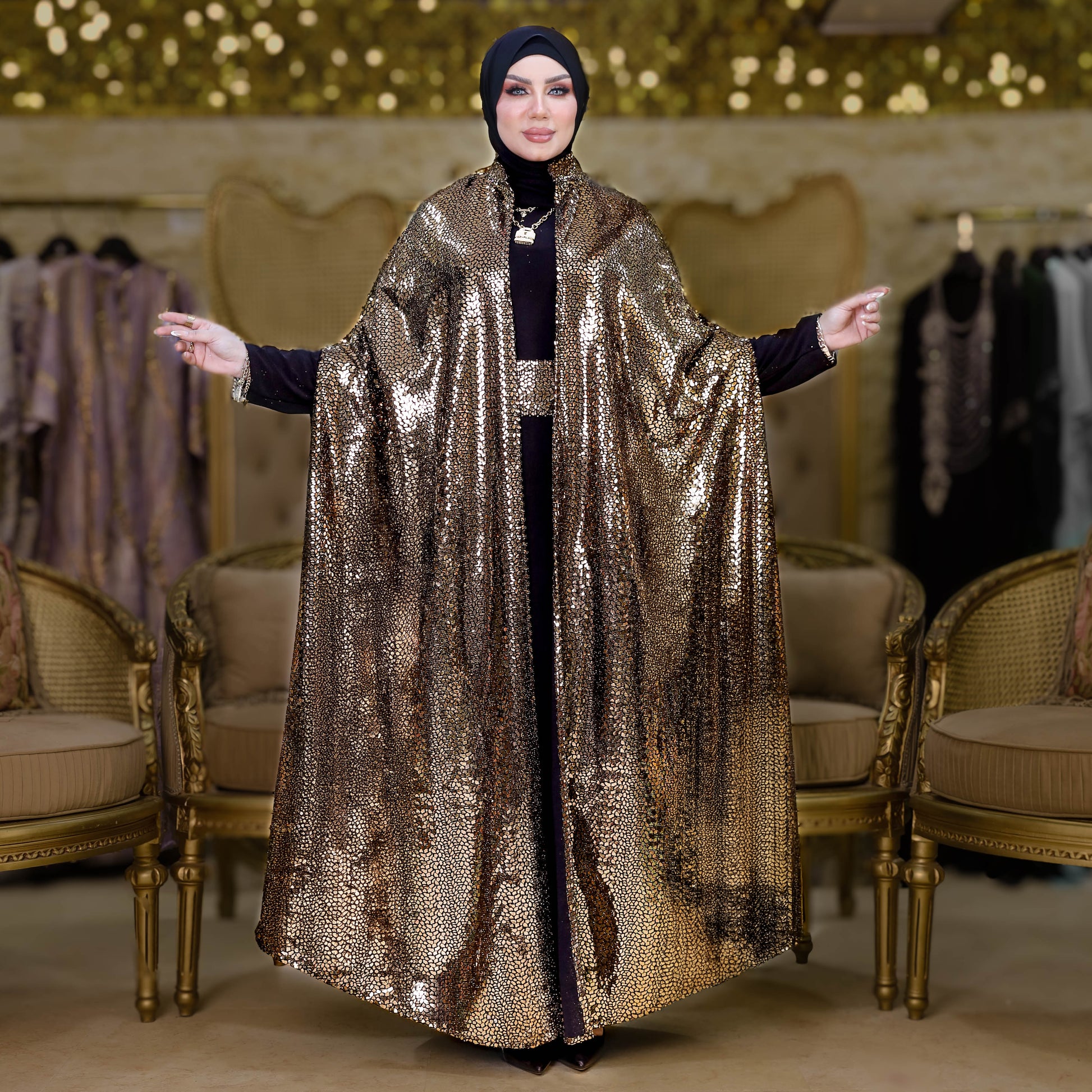 قفطان سواريه من خامة كريستال شايني + حزام لون القفطان، بدون بيزك , فري سايز يناسب ٧٠ك إلى ١٢٠ك