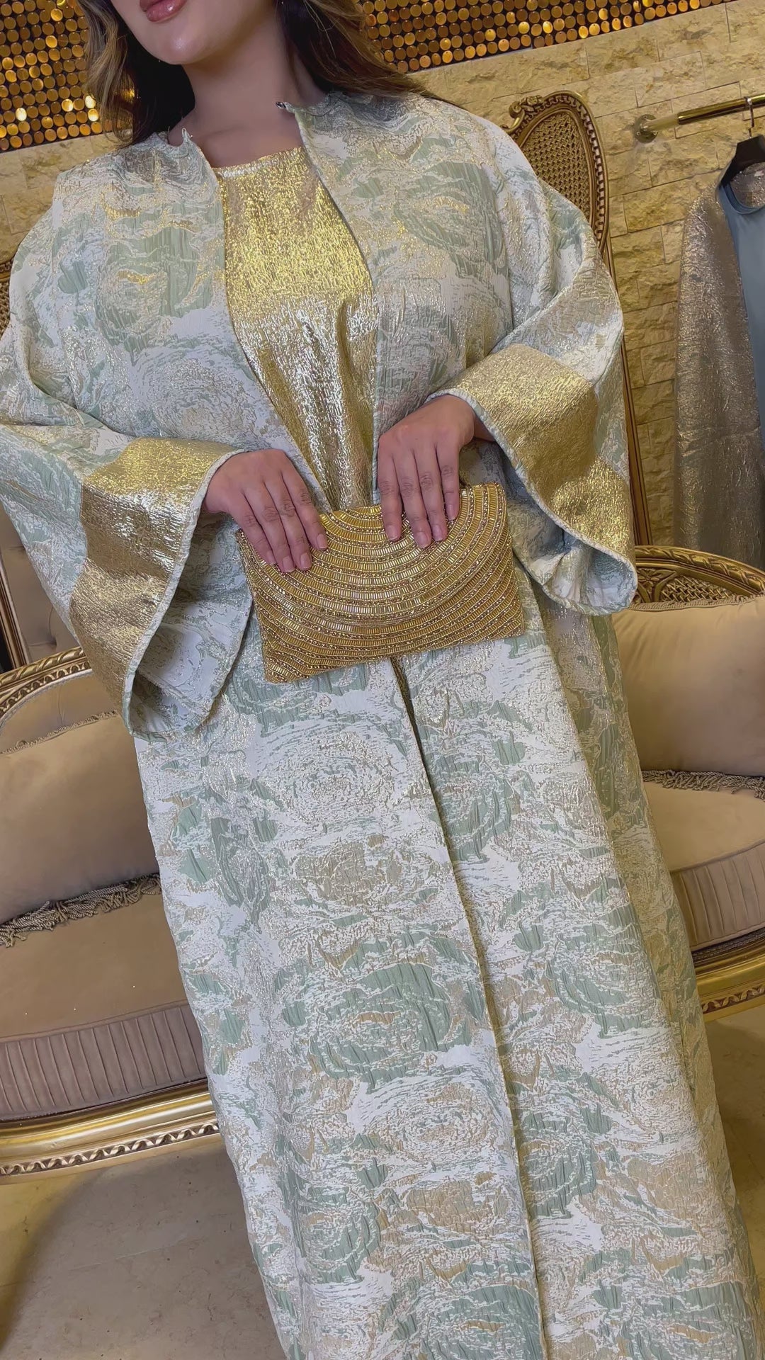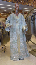 طقم قطعتين سواريه بروكار قفطان بحريني من قماش البروكار السواريه اللامع مع بيزك بروكار ذهبي فري سايز يناسب ٧٠ك إلى ١٠٠ك