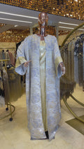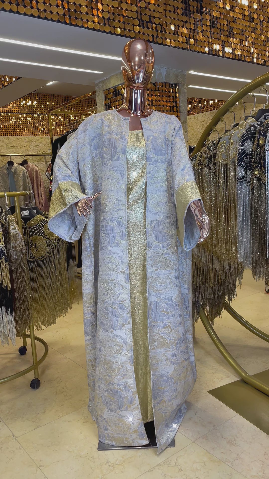 طقم قطعتين سواريه بروكار قفطان بحريني من قماش البروكار السواريه اللامع مع بيزك بروكار ذهبي فري سايز يناسب ٧٠ك إلى ١٠٠ك