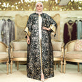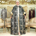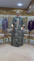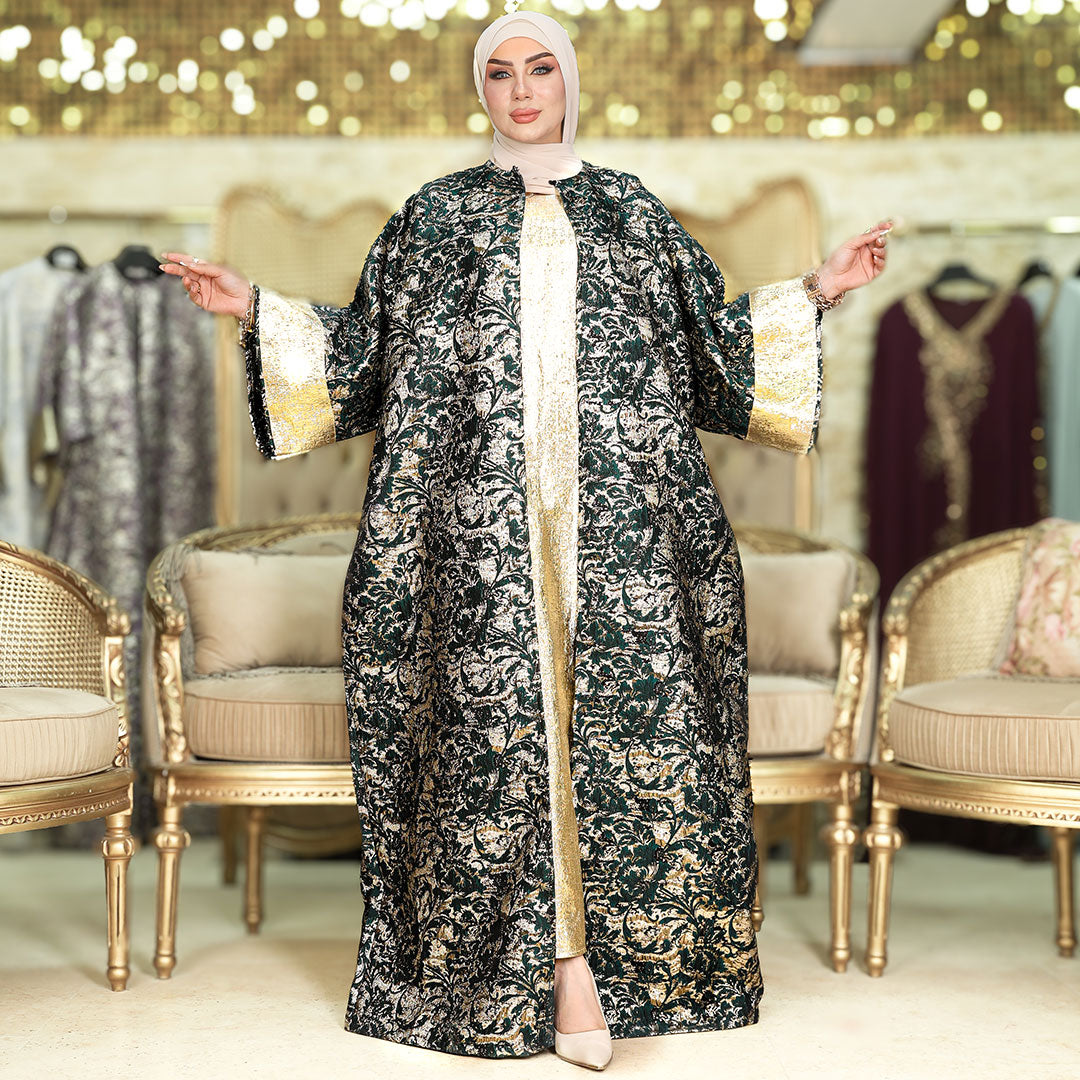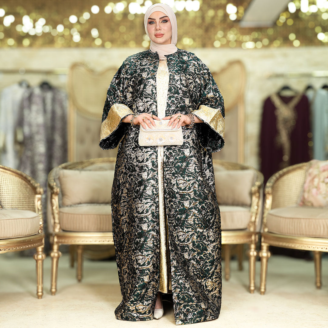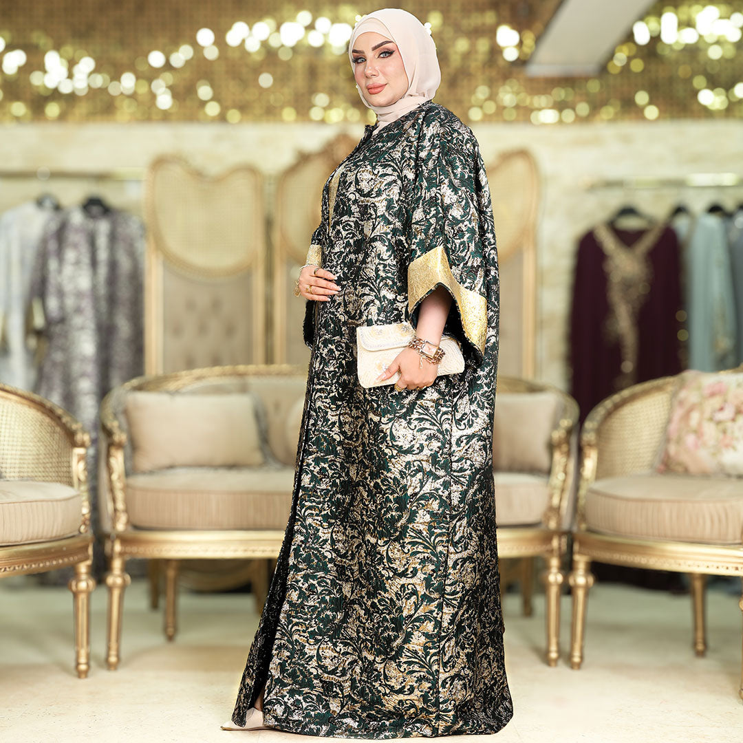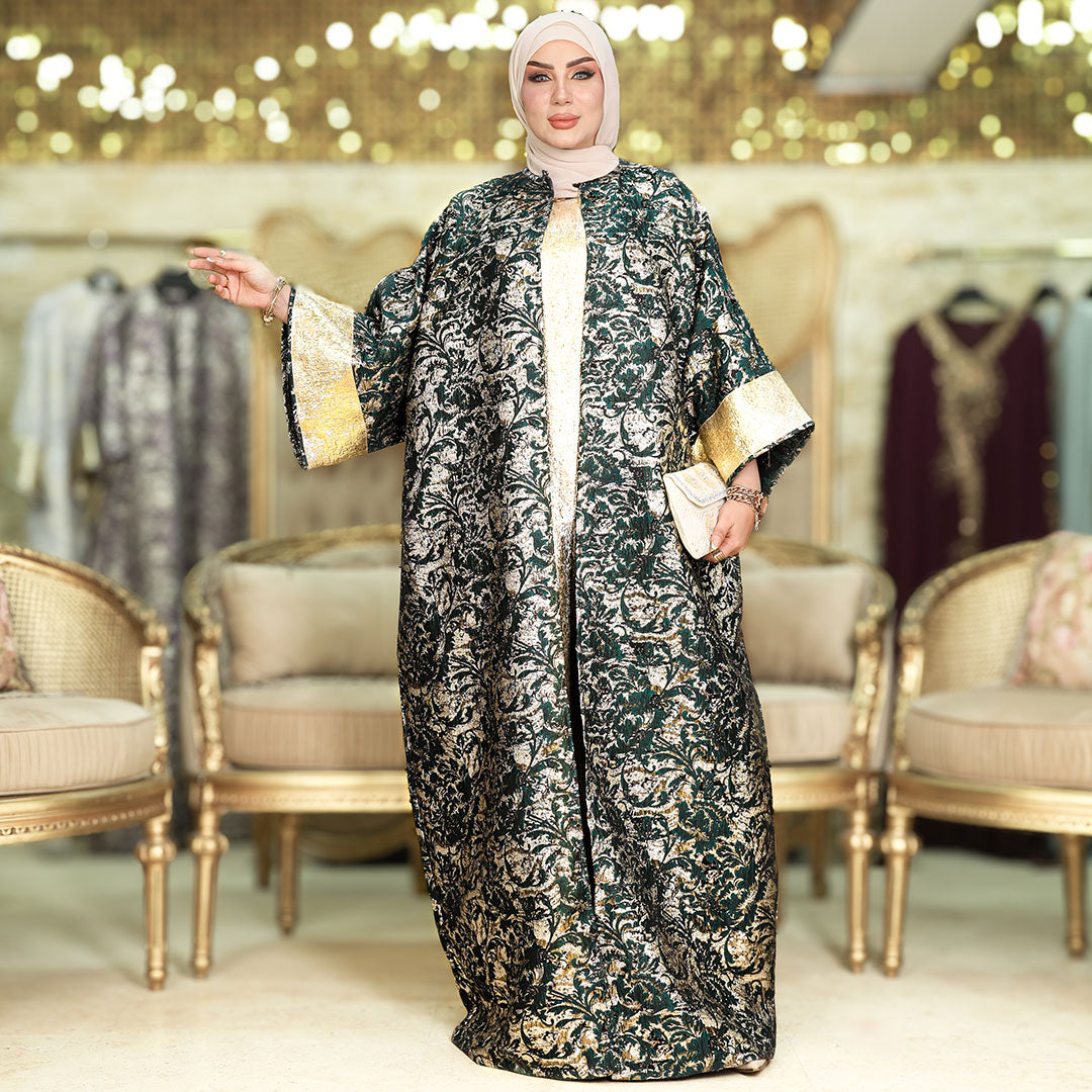طقم قطعتين سواريه بروكار قفطان بحريني من قماش البروكار السواريه اللامع مع بيزك بروكار ذهبي فري سايز يناسب ٧٠ك إلى ١٠٠ك
