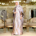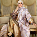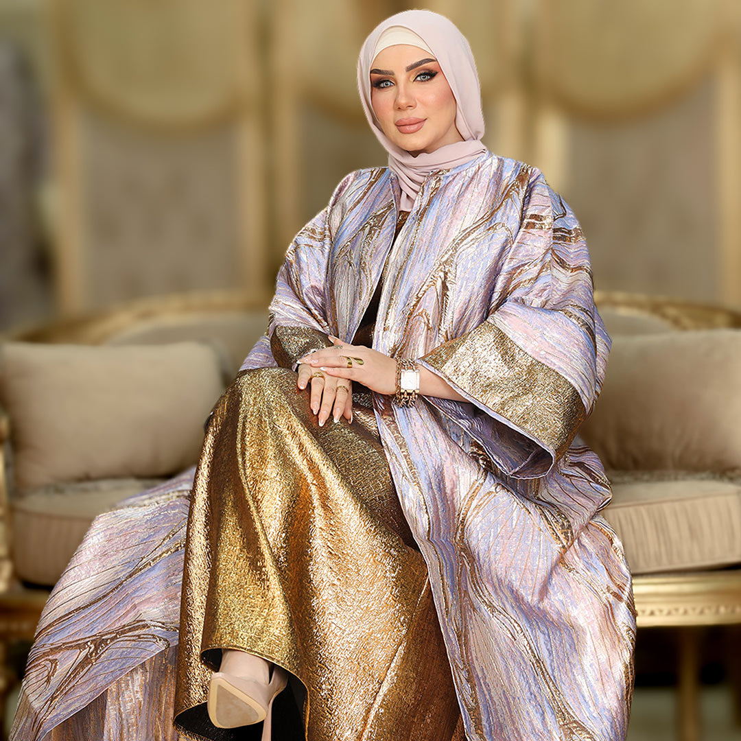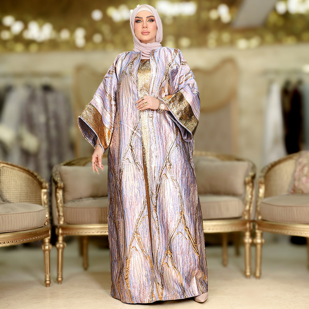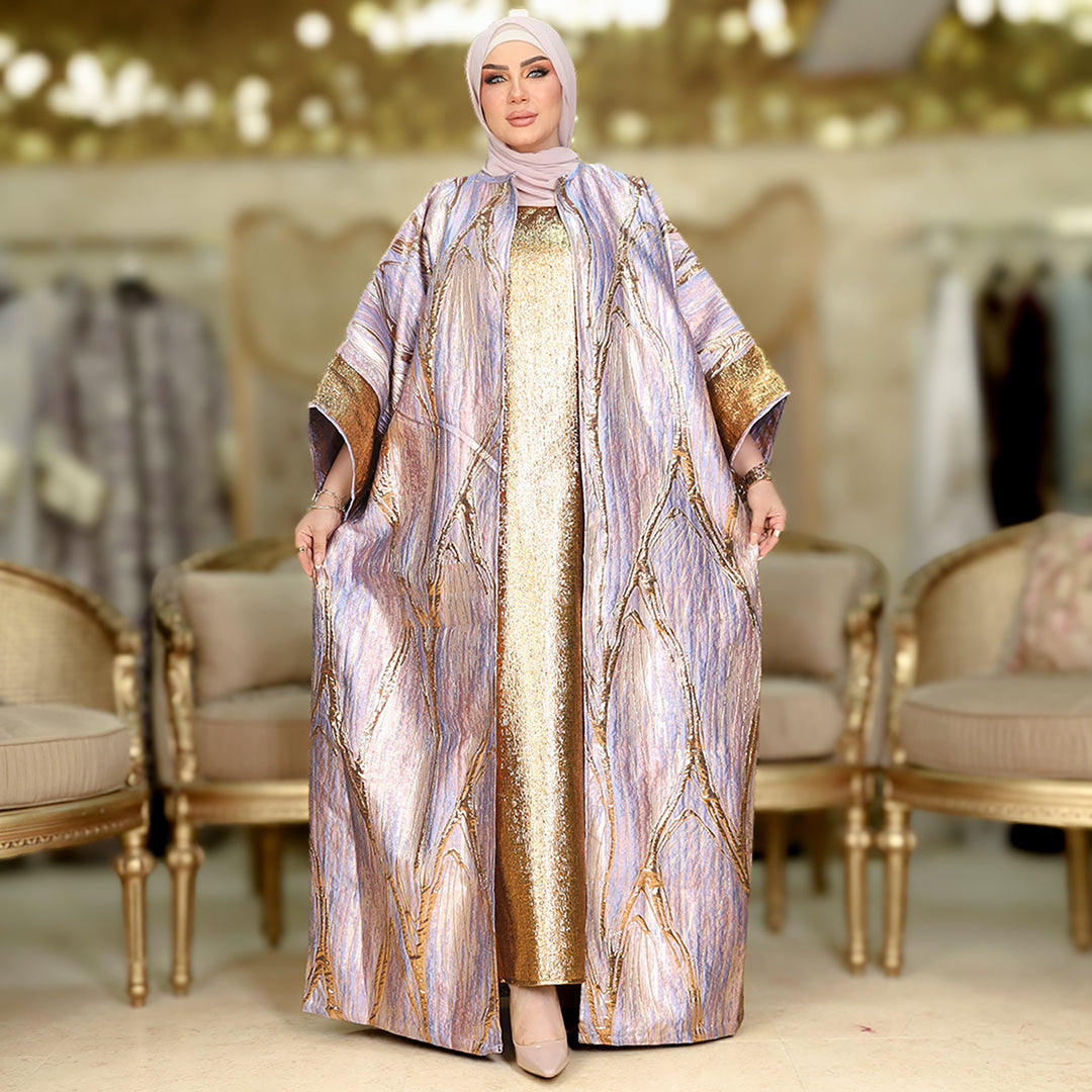 طقم قطعتين سواريه بروكار قفطان بحريني من قماش البروكار السواريه اللامع مع بيزك بروكار ذهبي فري سايز يناسب ٧٠ك إلى ١٠٠ك
