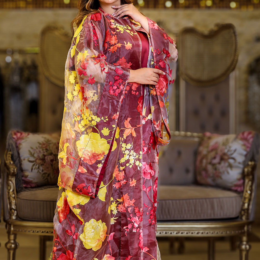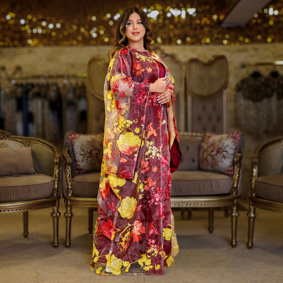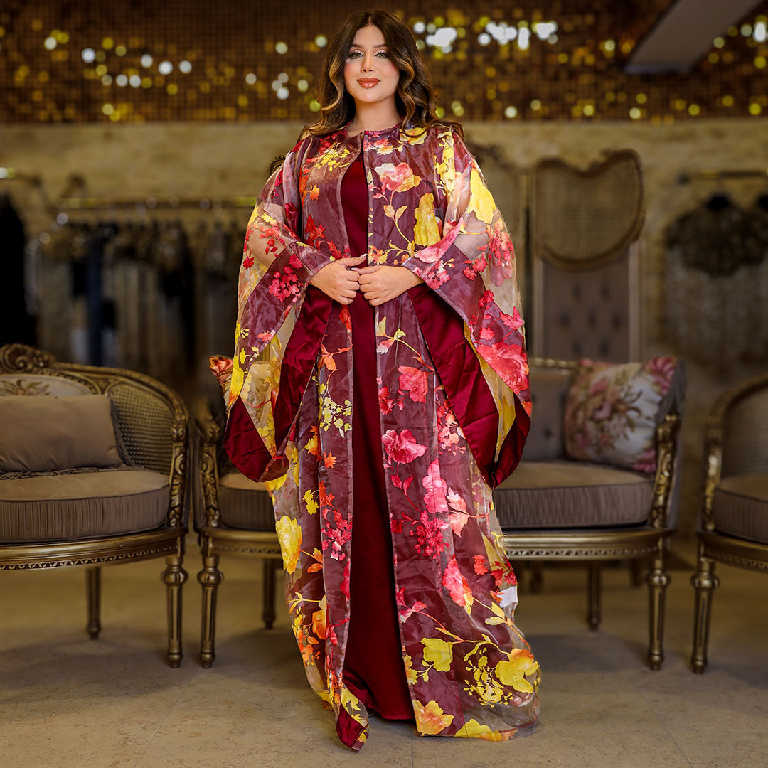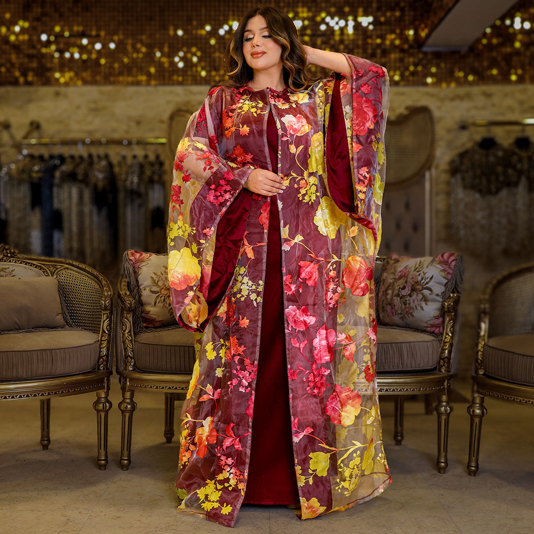 قفطان بحريني أورجانزا مطبوع ديجيتال قطعتين مع بيزك ستان أرماني