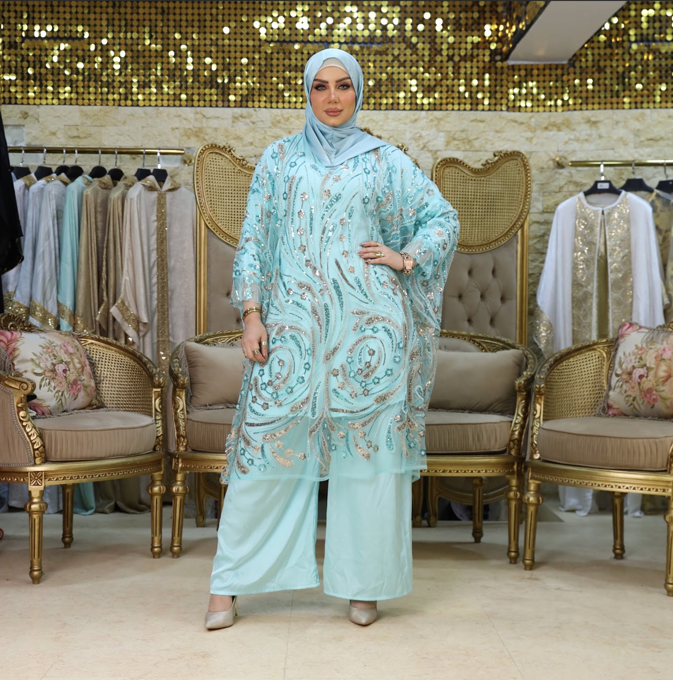 سوت قطعتين سواريه من خامة الأورجانزا فري سايز تناسب ٧٠ك إلى ١٢٠ك