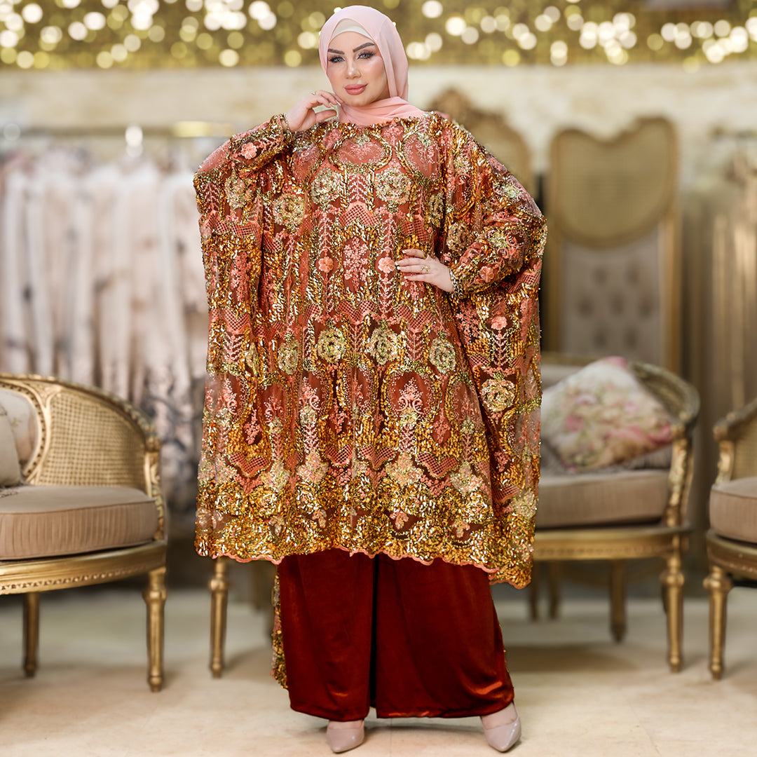 البنطلون شمواه بشريط تطريز أورجانزا من الجانب.