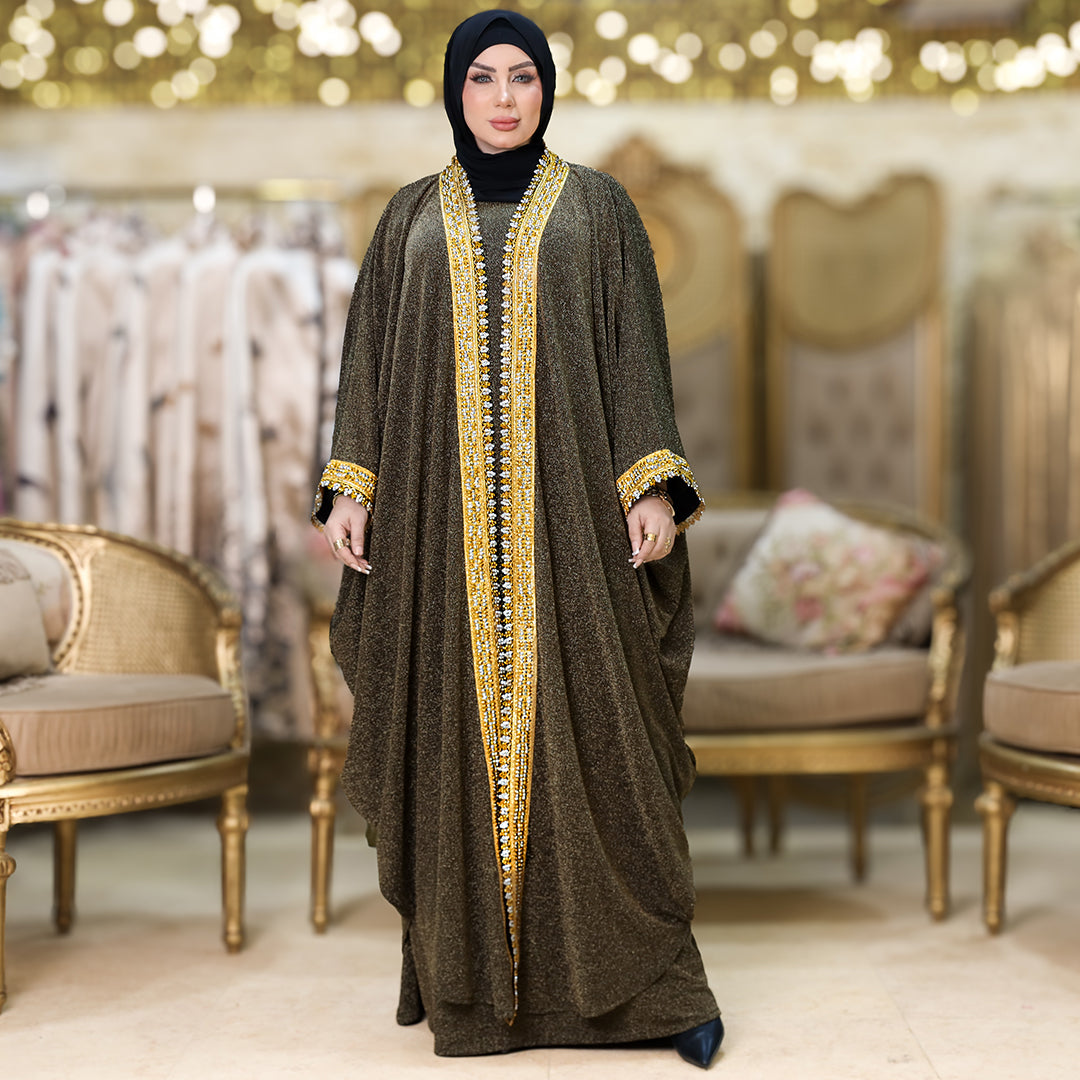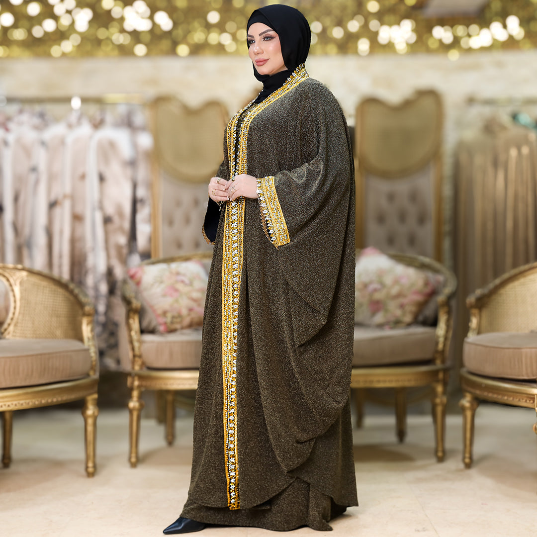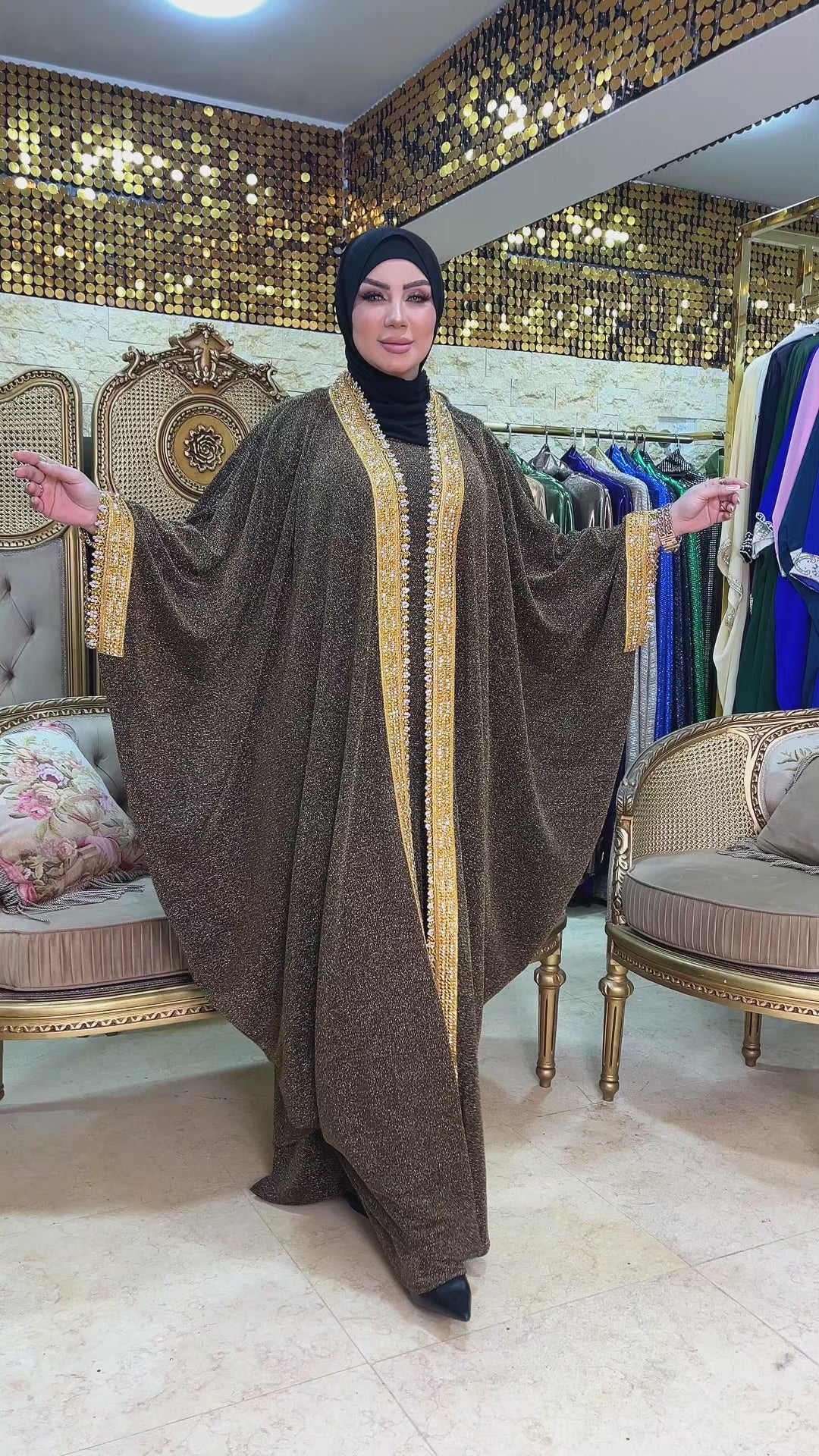 طقم قفطان إماراتي من مصنعنا بدبي، قطعتين من خامة االشايني ليكرا جليتر مطرز بشريط هندي زيركون و كريستالات فري سايز يناسب ٧٠ك إلى ١٠٠ك