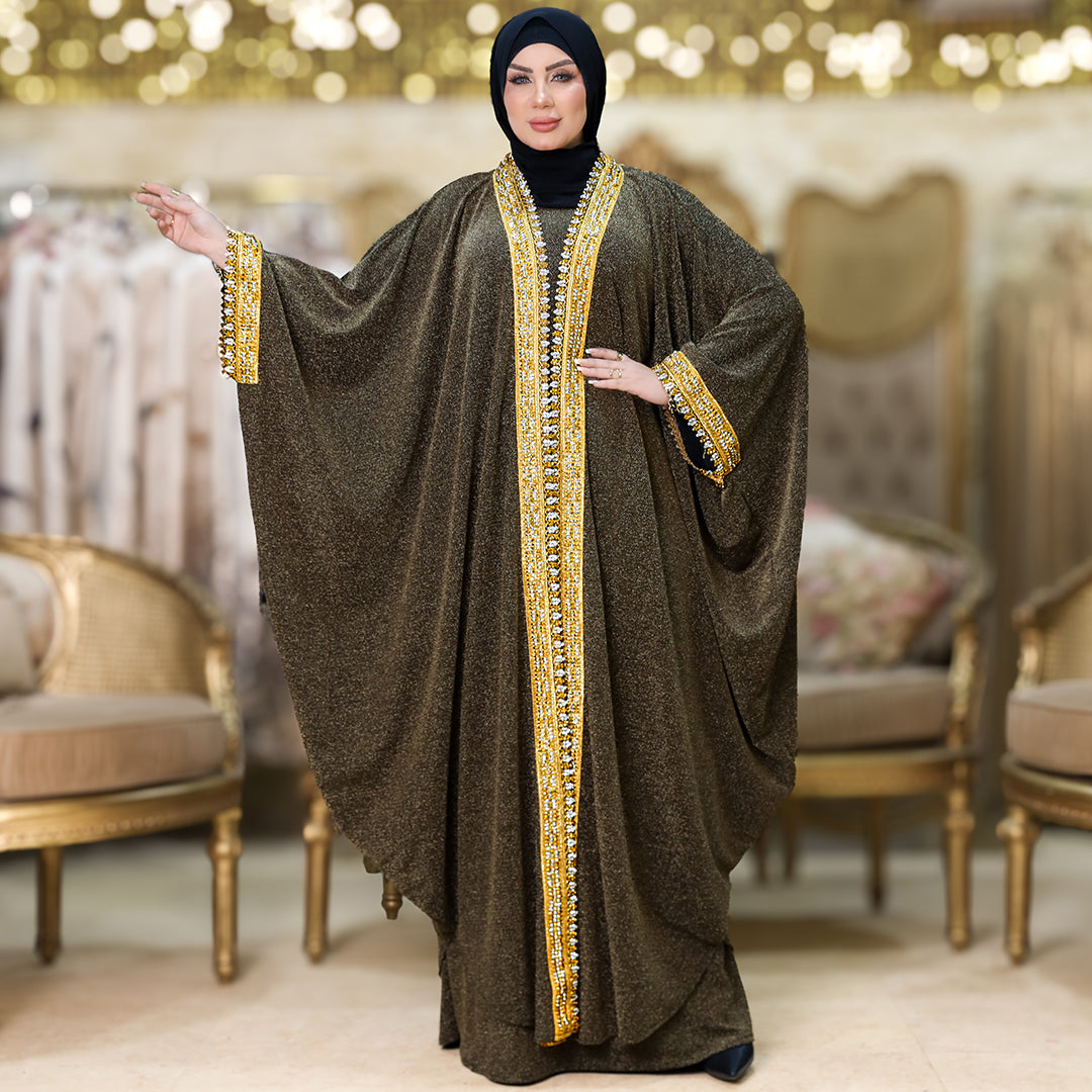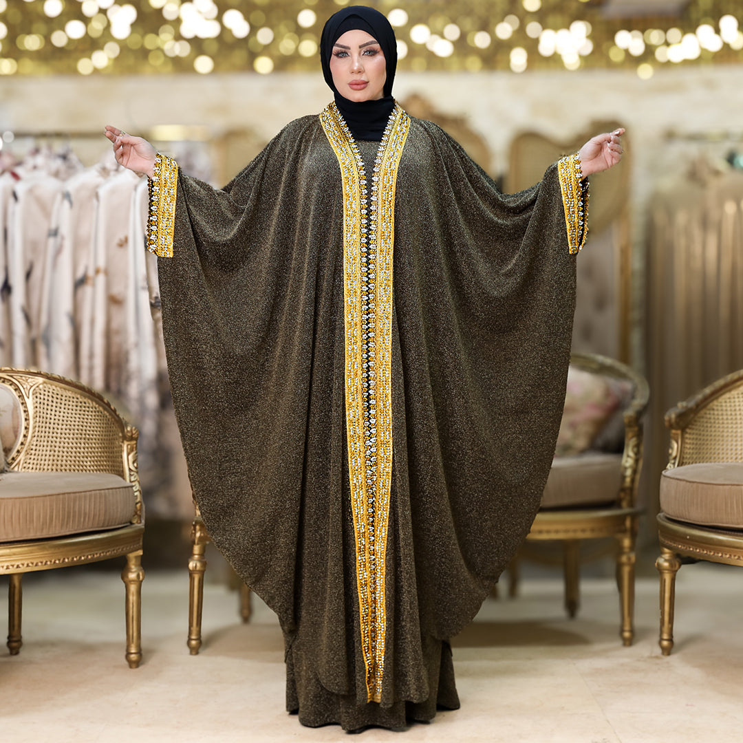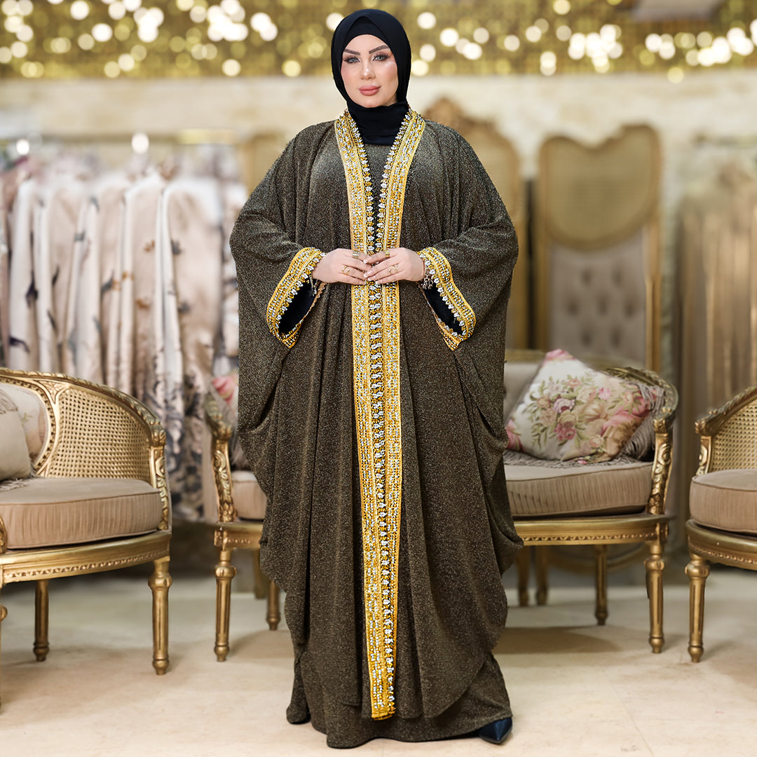 طقم قفطان إماراتي من مصنعنا بدبي، قطعتين من خامة االشايني ليكرا جليتر مطرز بشريط هندي زيركون و كريستالات فري سايز يناسب ٧٠ك إلى ١٠٠ك