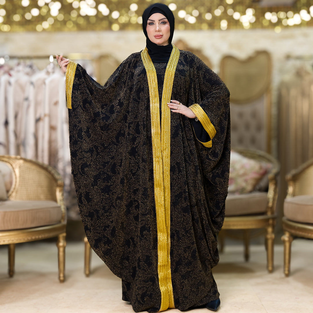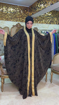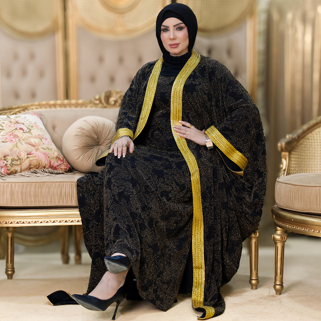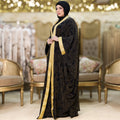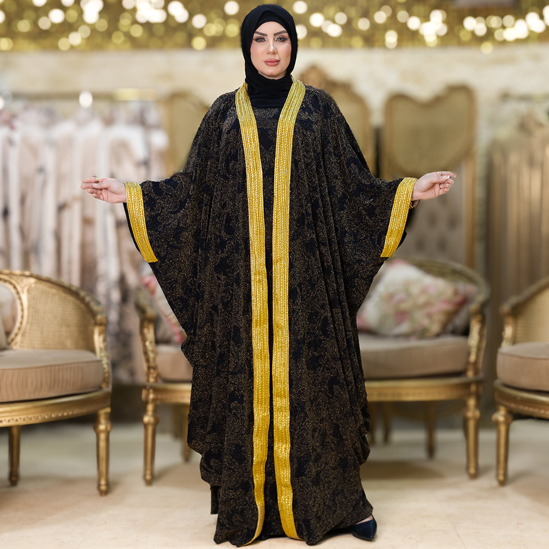 طقم قفطان إماراتي من مصنعنا بدبي، قطعتين من خامة االشايني ليكرا مطرز بشريط هندي فري سايز يناسب ٧٠ك إلى ١٠٠ك