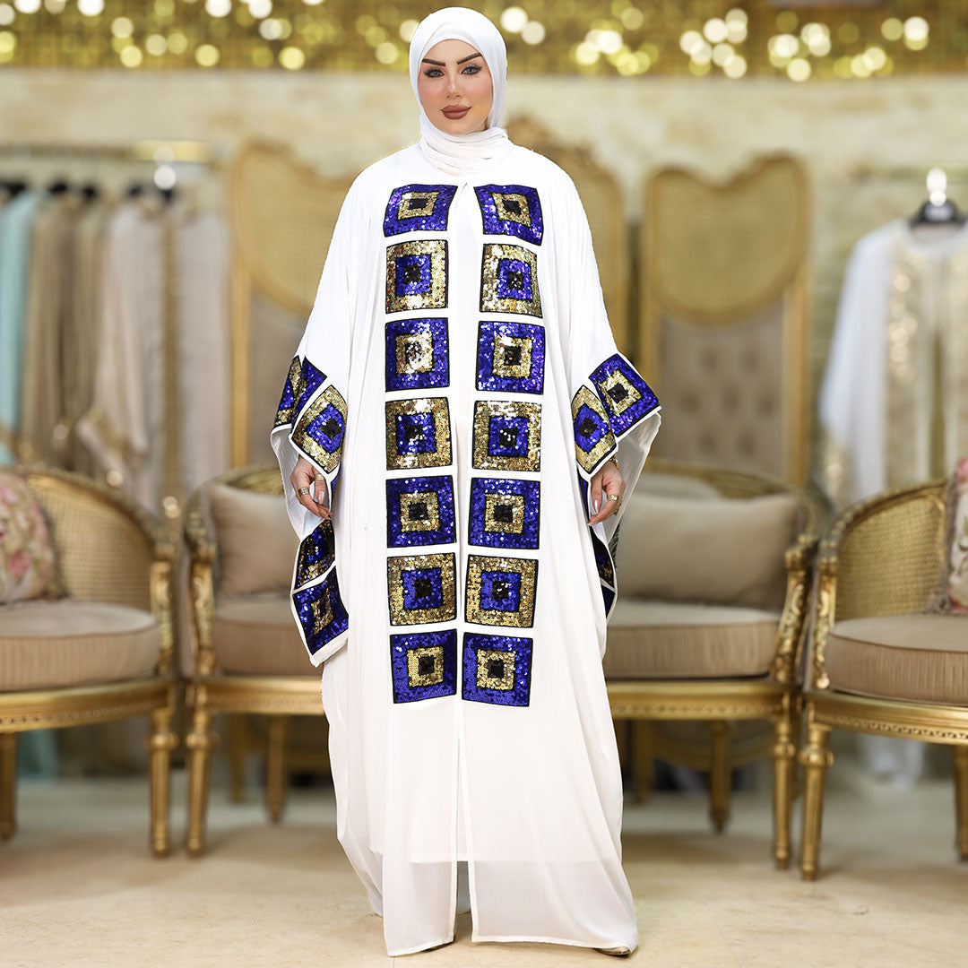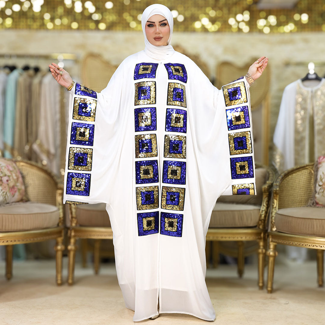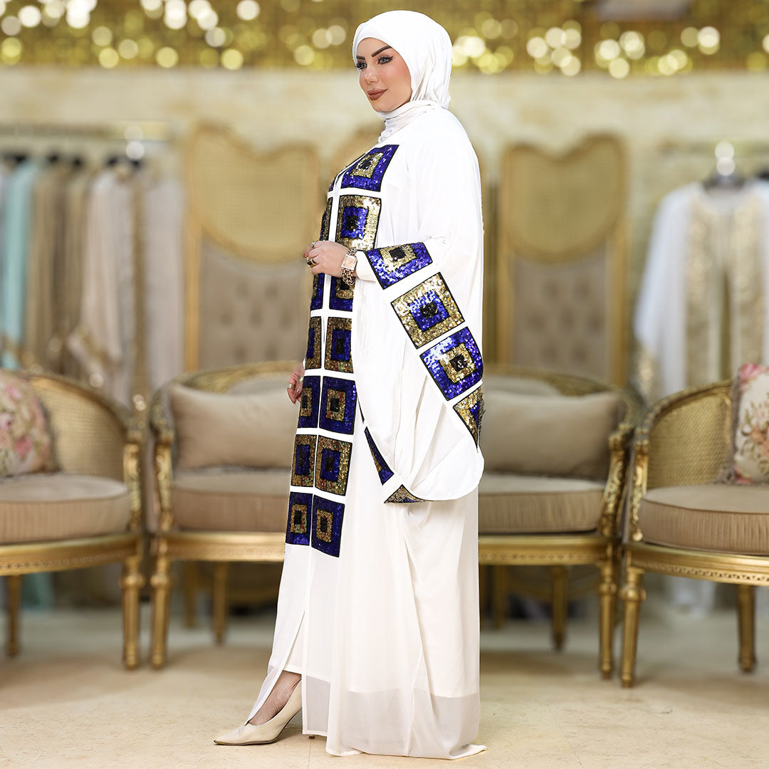قفطان بحريني من الشيفون الناعم الشفاف تطريز كامل بالترتر الذهبي مع مزيج من الألوان المبهجة،