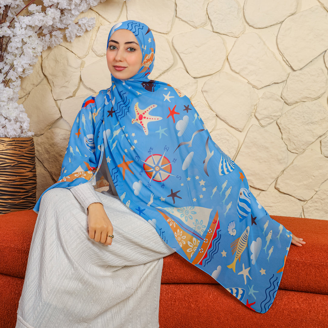 طرحة من الكريب شيفون الناعم مطبوعة ديجيتال بتصميمات زمرد فاشون الفريدة.