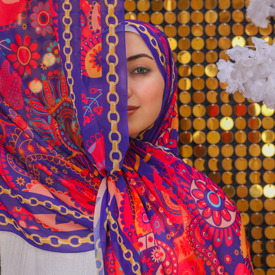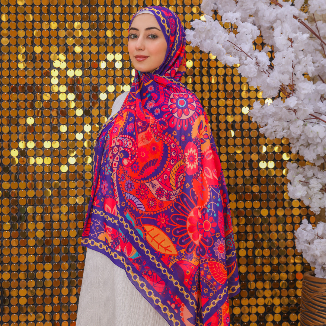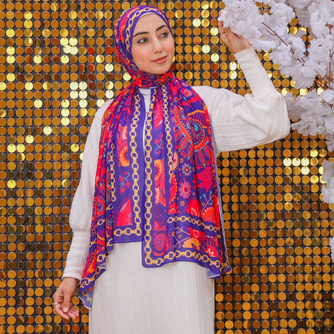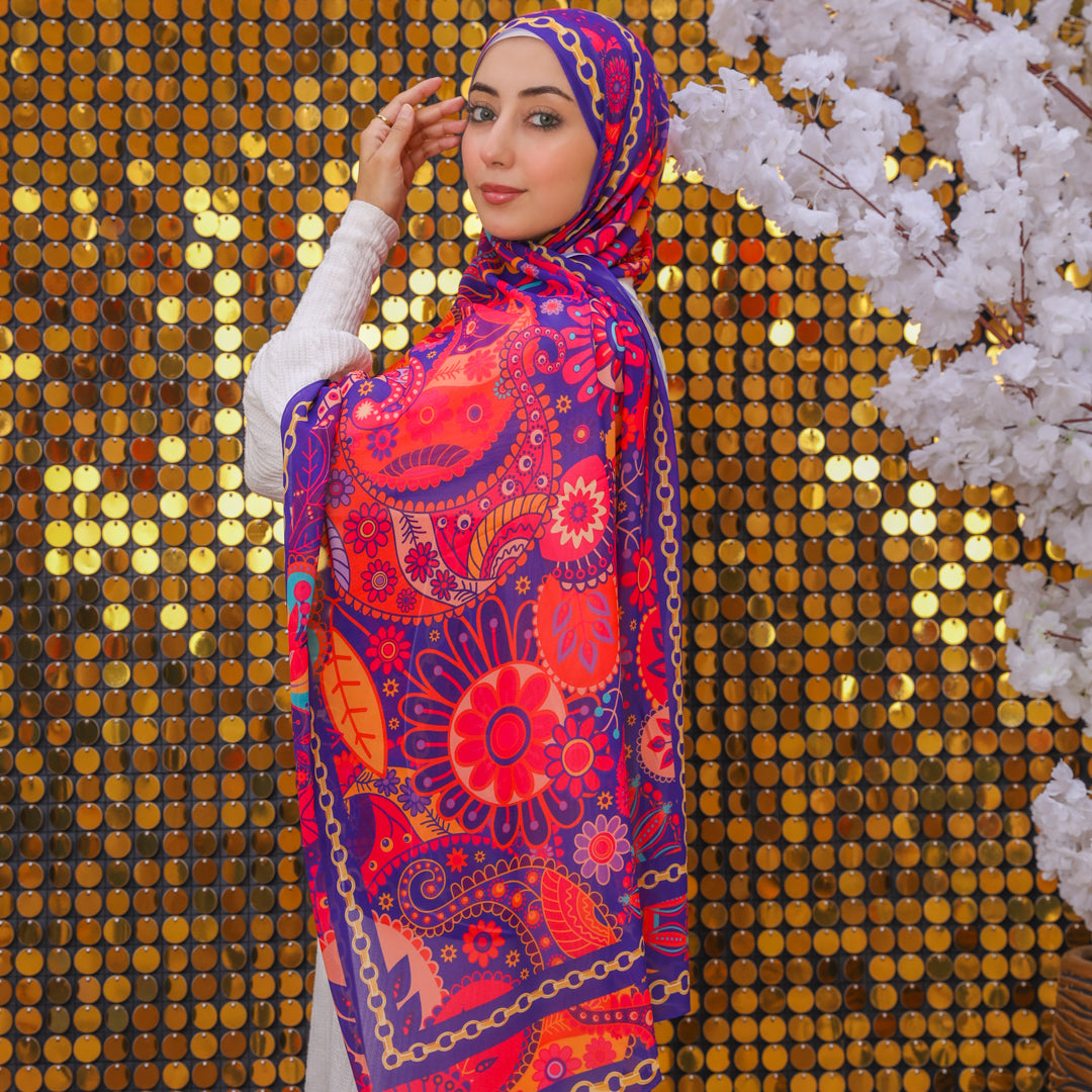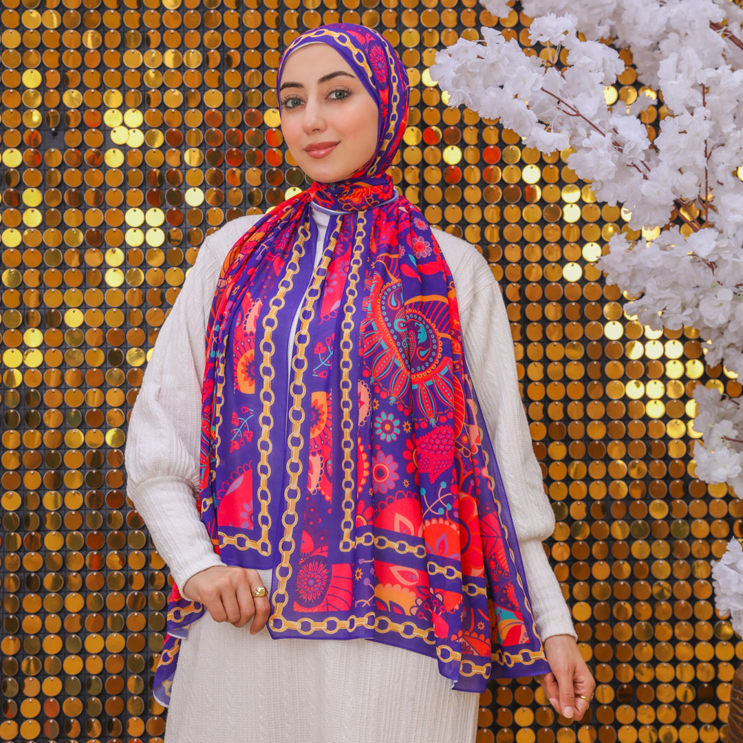 طرحة من الكريب شيفون الناعم مطبوعة ديجيتال بتصميمات زمرد فاشون الفريدة.