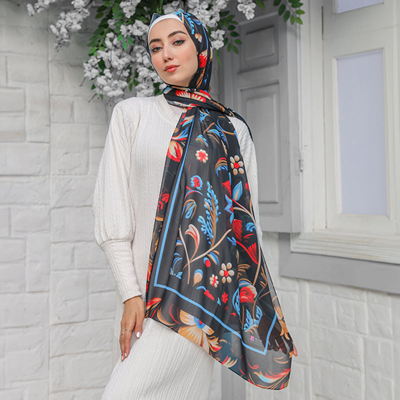 طرحة من الكريب شيفون الناعم مطبوعة ديجيتال بتصميمات زمرد فاشون الفريدة.