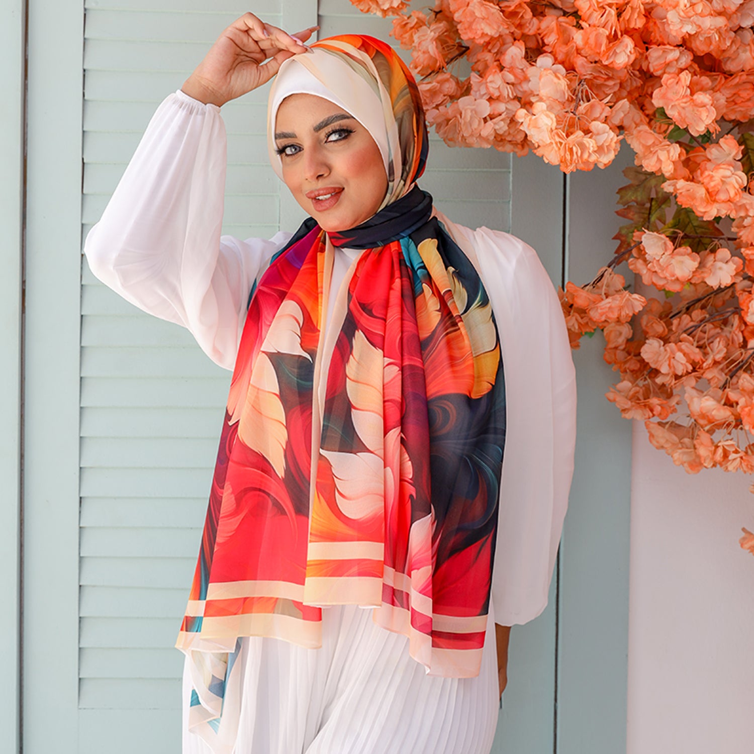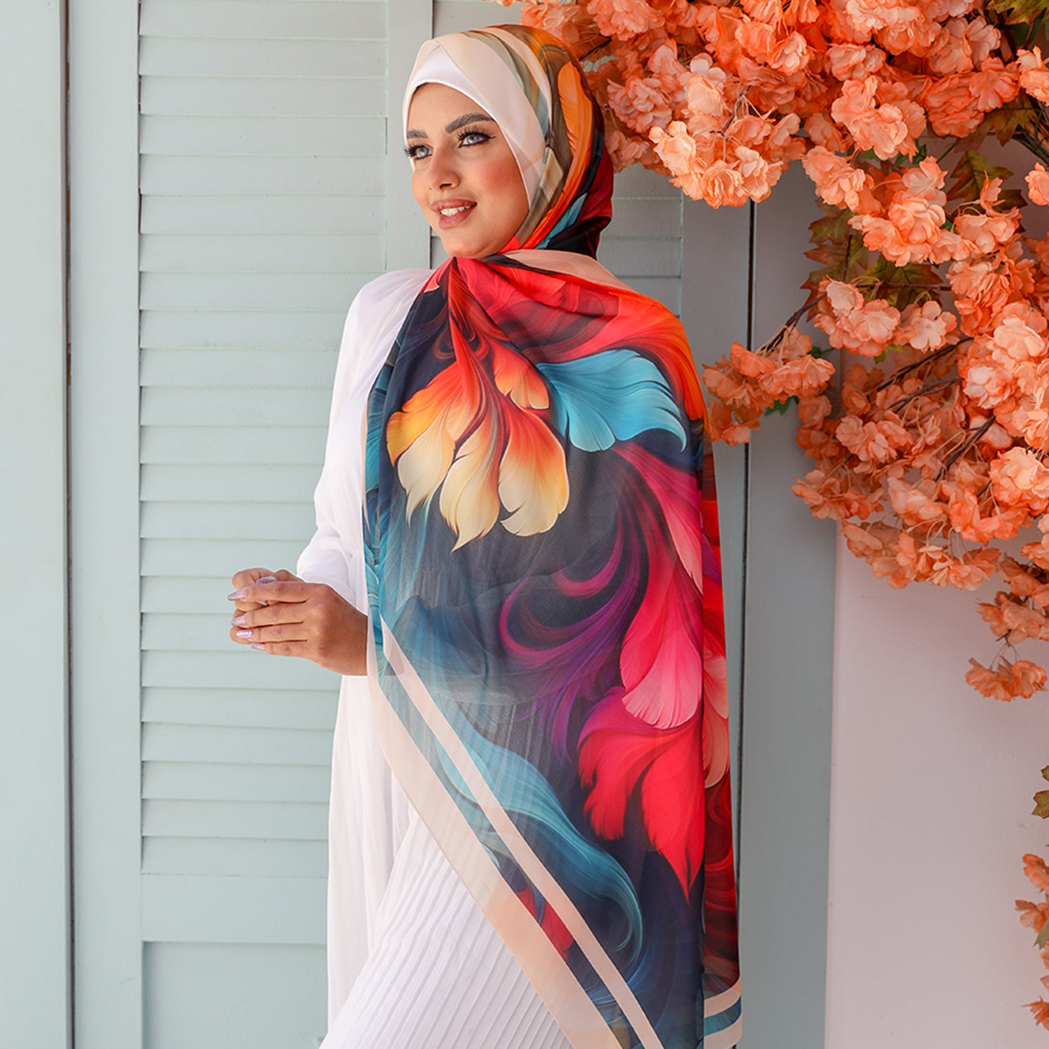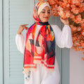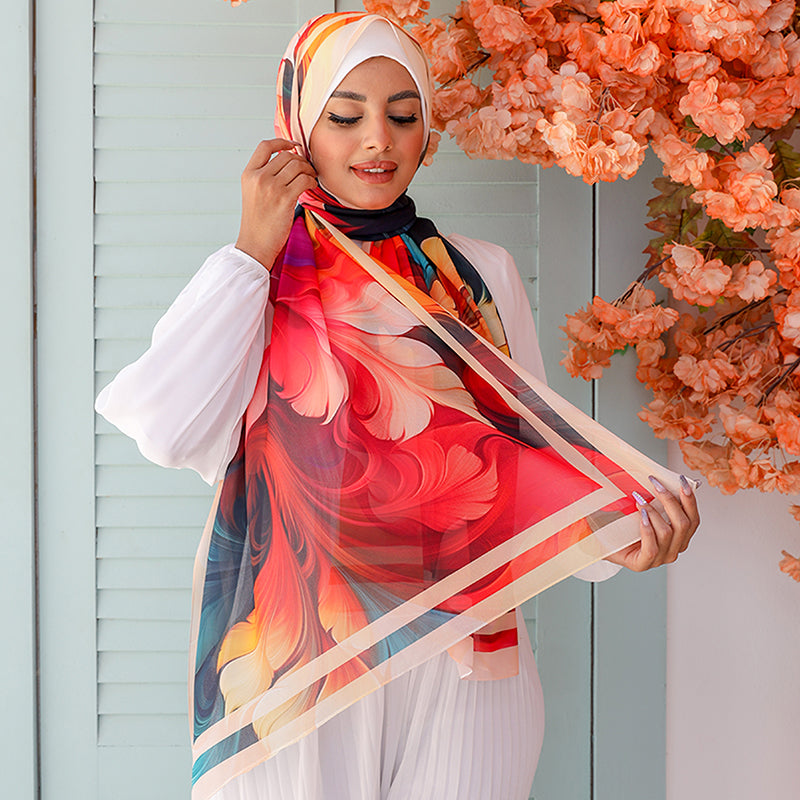 طرحة من الكريب شيفون الناعم مطبوعة ديجيتال بتصميمات زمرد فاشون الفريدة.