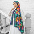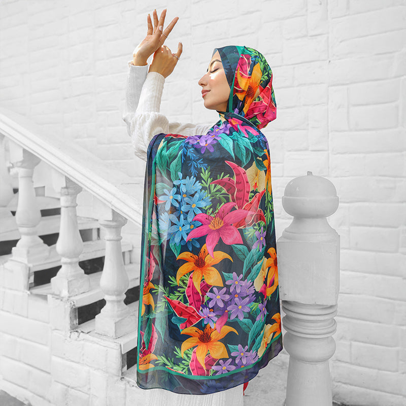 طرحة من الكريب شيفون الناعم مطبوعة ديجيتال بتصميمات زمرد فاشون الفريدة.