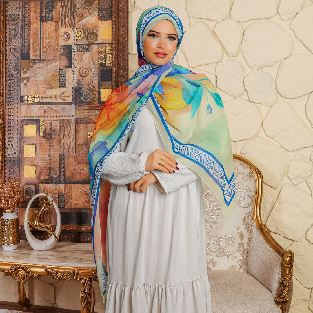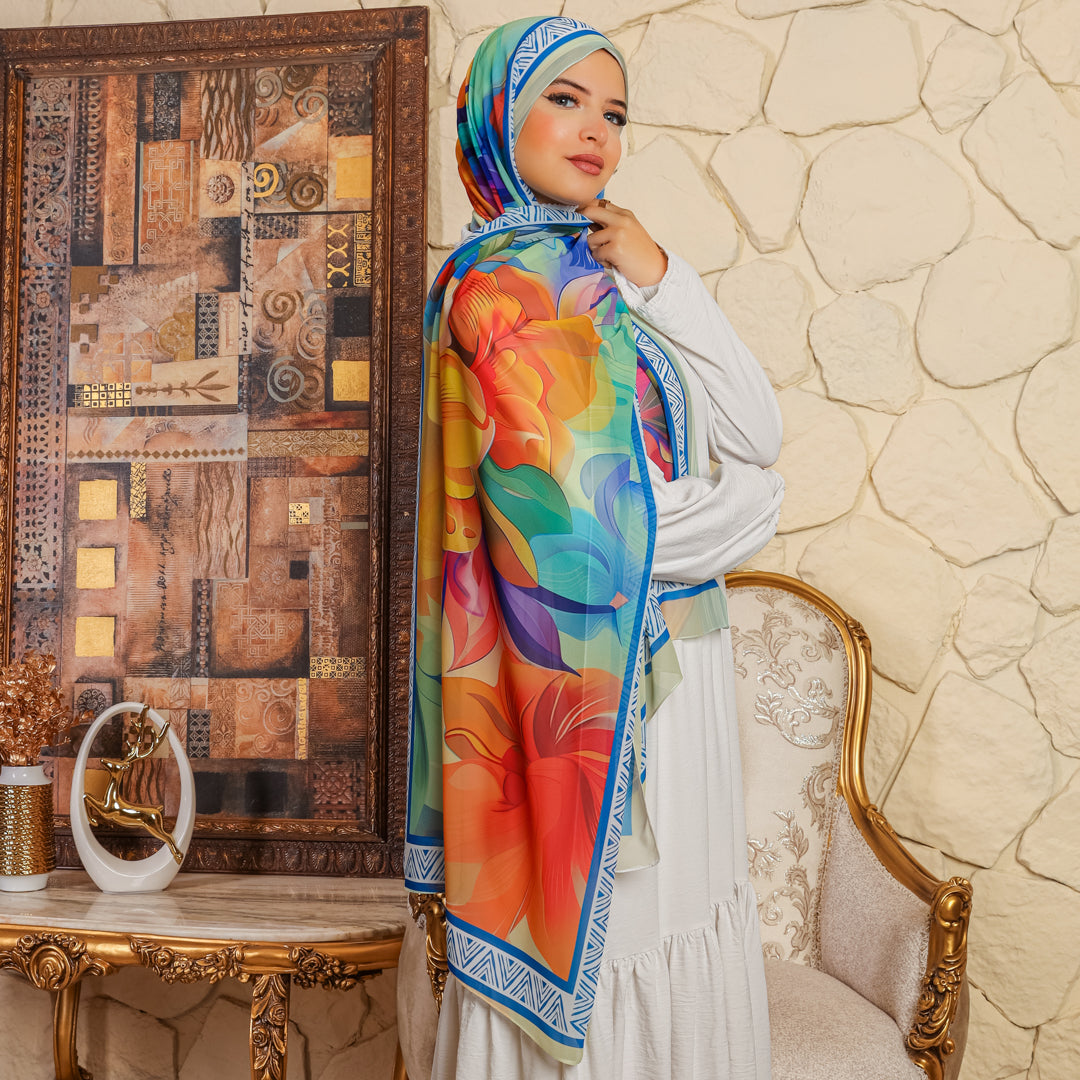 طرحة من الكريب شيفون الناعم مطبوعة ديجيتال بتصميمات زمرد فاشون الفريدة.